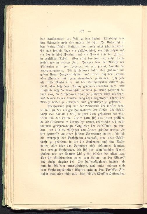 Ebensowenig steif war das Verhältnis der meisten Pro-fessoren zu den übrigen Honoratioren der Stadt. Die Gesell-schaft war damals (1850) in zwei Teile gespalten: das Mu-seum und das Kasino. Dieses hatte sich aus jenem gebildet,da die Studenten es durchgesetzt hatten, ordentliche d. h. voll-kommen gleichberechtigte Mitglieder der Gesellschaft zu wer-den. Da also die Mehrheit von Leuten gebildet wurde, diekein Interesse an einer soliden Verwaltung hatten, sah sichdie Mehrzahl der Professoren veranlaßt, eine neue Gesell-schaft zu gründen, in der die Studenten auch ihre Rechtehatten, aber über das Vermögen nicht abstimmen konnten.Nur wenige Professoren, die sich zur demokratischen Parteizählten, wie der Anatom Fick z. B., blieben der alten treu.Von den Studierenden traten dem Kasino nur der Wingolfund einige einzelne bei. Die Hassenpflugiancr suchten sichnun im Museum unterzubringen, was unter anderen auchdem Regierungsdirektor Wegner gelang; den Professor Ilsenahm man aber nicht auf. Als sich der Minister Hassenpflug