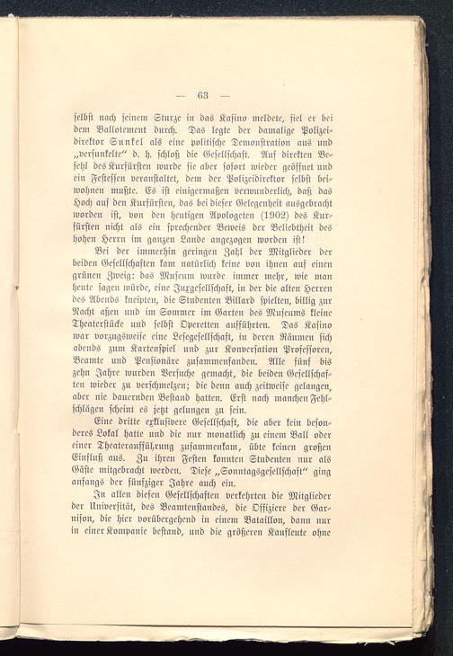 Eine dritte exklusivere Gesellschaft, die aber kein beson-deres Lokal hatte und die nur monatlich zu einem Ball odereiner Theateraufführnug zusammenkam, übte keinen großenEinfluß aus. Zu ihren Festen konnten Studenten nur alsGäste mitgebracht werden. Diese „Sonntagsgesellschaft" ginganfangs der fünfziger Jahre auch ein.