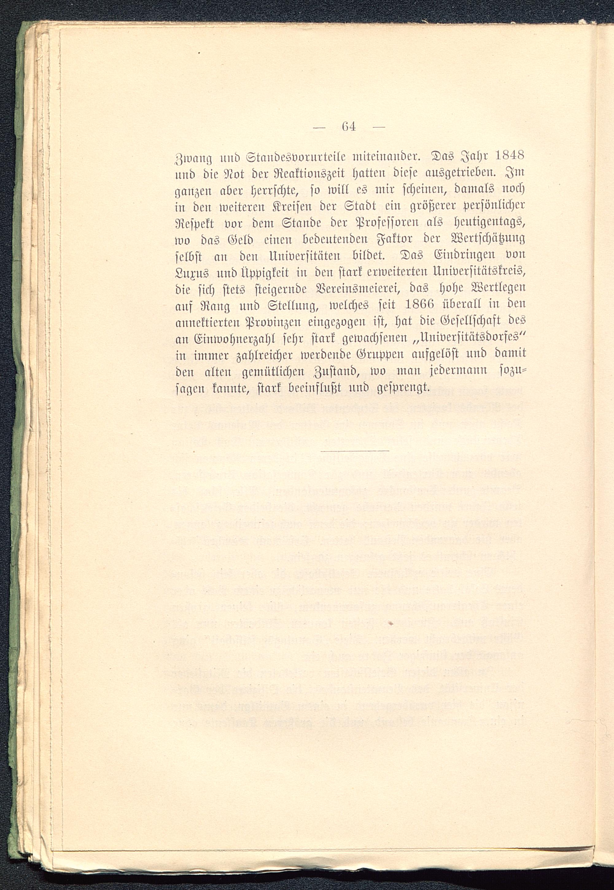 Zwang und Standesvornrtcile miteinander. Das Jahr 1848nnd die Not der Reaktionszeit hatten diese ausgetrieben. Imganzen aber herrschte, so will es mir scheinen, damals nochin den weiteren Kreisen der Stadt ein größerer persönlicherRespekt vor dem Stande der Professoren als heutigentags,wo das Geld einen bedeutenden Faktor der Wertschätzungselbst an den Universitäten bildet. Das Eindringen vonLuxus und Üppigkeit in den stark erweiterten Universitätskreis,die sich stets steigernde Vereinsmeierei, das hohe Wertlcgenauf Rang und Stellung, welches seit 1866 überall in denannektierten Provinzen eingezogen ist, hat die Gesellschaft desan Einwohnerzahl sehr stark gewachsenen „Univcrsitätsdorfes"in immer zahlreicher werdende Gruppen aufgelöst und damitden alten gemütlichen Zustand, wo man jedermann sozu-sagen kannte, stark beeinflußt und gesprengt.