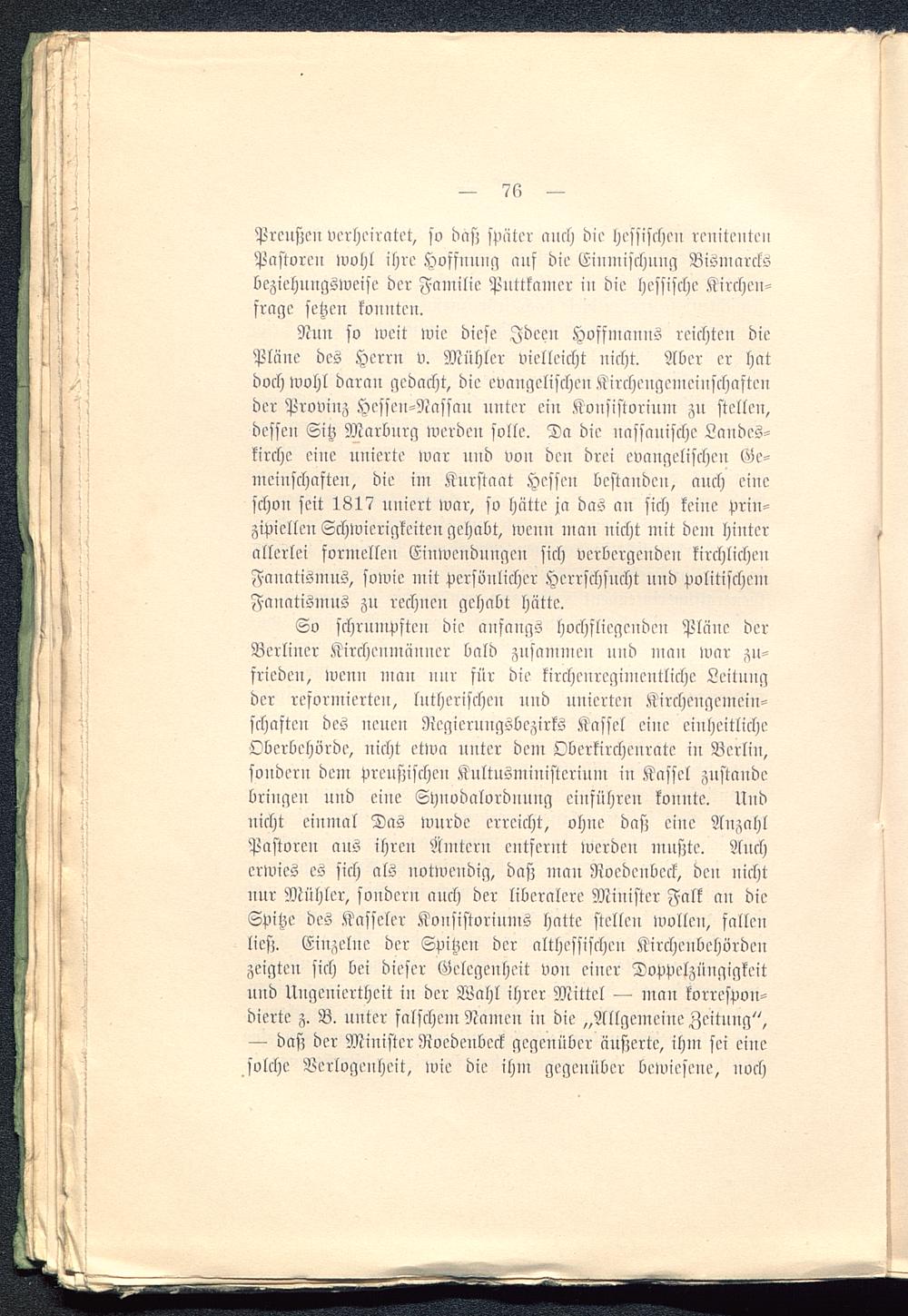 So schrumpften die anfangs hochfliegendcn Pläne derBerliner Kirchenmänner bald zusammen nnd man war zu-frieden, wenn man nur für die kirchenreginientliche Leitungder reformierten, lutherischen nnd nnicrten Kirchengcmein-schaftcn des neuen Regierungsbezirks Kassel eine einheitlicheOberbehörde, nicht etwa unter dem Oberkirchcnrate in Berlin ,sondern dem Preußischen Kultusministerium in Kassel zustandebringen und eine Synodalordnnng einführen konnte. Undnicht einmal Das wurde erreicht, ohne daß eine AnzahlPastoren aus ihren Ämtern entfernt werden mußte. Aucherwies es sich als notwendig, daß man Rocdcnbcck, den nichtnur Mähler, sondern auch der liberalere Minister Falk au dieSpitze des Kasseler Konsistoriums hatte stellen wollen, falle»ließ. Einzelne der Spitzen der althessischen Kirchenbehördcnzeigten sich bei dieser Gelegenheit von einer Doppelzüngigkeitund Ungcuiertheit in der Wahl ihrer Mittel — man korrespon-dierte z. B. unter falschem Namen in die „Allgemeine Zeitung ",— daß der Minister Rocdenbeck gegenüber äußerte, ihm sei einesolche Verlogenheit, wie die ihm gegenüber bewiesene, noch