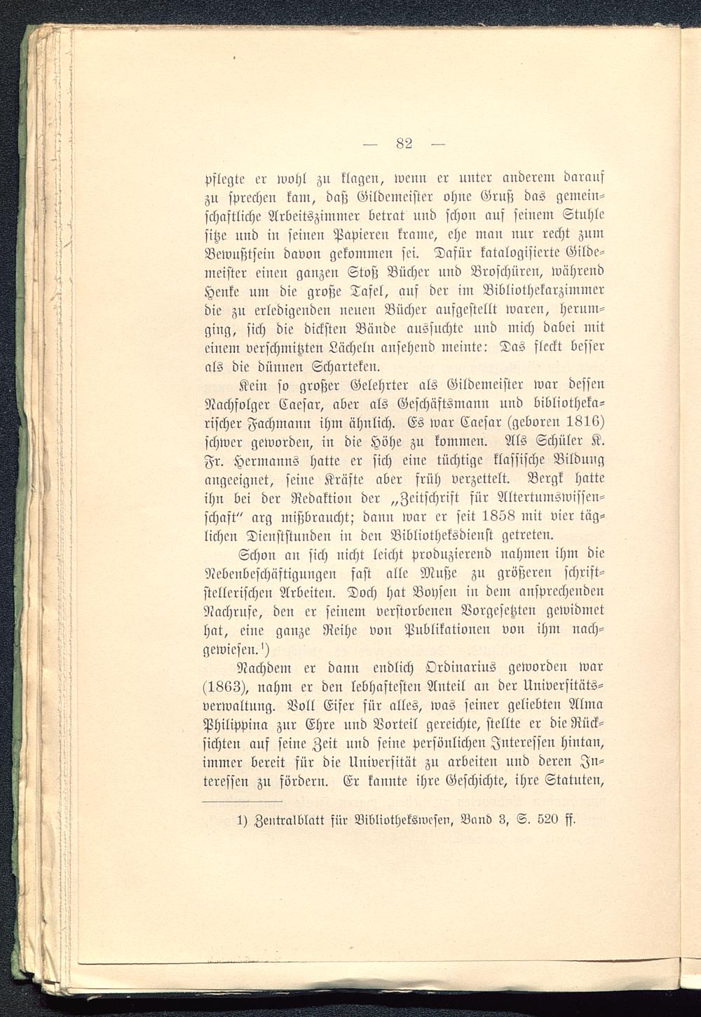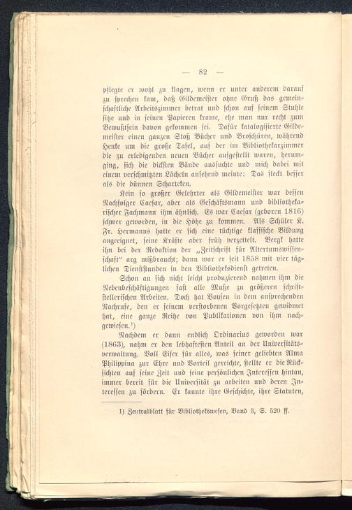 Kein so großer Gelehrter als Gildemeister war dessenNachfolger Caesar, aber als Geschäftsmann und bibliotheka-rischer Fachmann ihm ähnlich. Es war Caesar (geboren 1816)schwer geworden, in die Höhe zu kommen. Als Schüler K.Fr. Hermanns hatte er sich eine tüchtige klassische Bildungangeeignet, seine Kräfte aber früh verzettelt. Bergk hatteihn bei der Redaktion der „Zeitschrift für Altertumswissen-schaft" arg mißbraucht; dann war er seit 1858 mit vier täg-lichen Dicnststunden in den Bibliotheksdienst getreten.