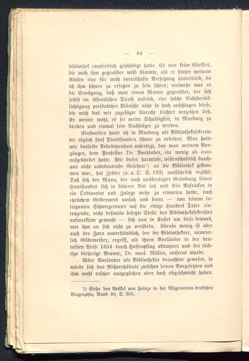 Einstweilen hatte ich in Marburg als Bibliothekssekretärbei täglich fünf Dienststundcn schwer zu arbeiten. Man hattemir dasselbe Arbeitspensum auferlegt, das man meinem Vor-gänger, dem Professor Dr. Vorländer, ein wenig ab iratoaufgebürdet hatte. Wie dieser harmlose, wissenschaftlich durch-aus nicht unbedeutende Gelehrtes an die Bibliothek gekom-men war, hat Zedler (a. a. O. S. 133) ausführlich erzählt.Daß sich der Mann, der nach unüberlegter Gründung seinesHausstandes sich in bitterer Not sah und kein Aufrücken inein Ordinariat und Zulage mehr zu erwarten hatte, nachehrlichem Gelderwerb umsah und dann — von seinem in-triganten Schwiegervater auf die einige Hundert Taler ein-tragende, nicht definitiv besetzte Stelle des Bibliothekssekretärsaufmerksam gemacht — sich nun in Kassel um diese bewarb,war ihm an sich nicht zu verübeln. Ebenso wenig ist aberauch der Zorn unverständlich, der die Bibliothekare, nament-lich Gildcmeister, ergriff, als ihnen Vorländer in der bru-talsten Weise 1854 durch Hassenpflng oktroyiert und der tüch-tige bisherige Beamte, Dr. naecl. Möller, entfernt wurde.