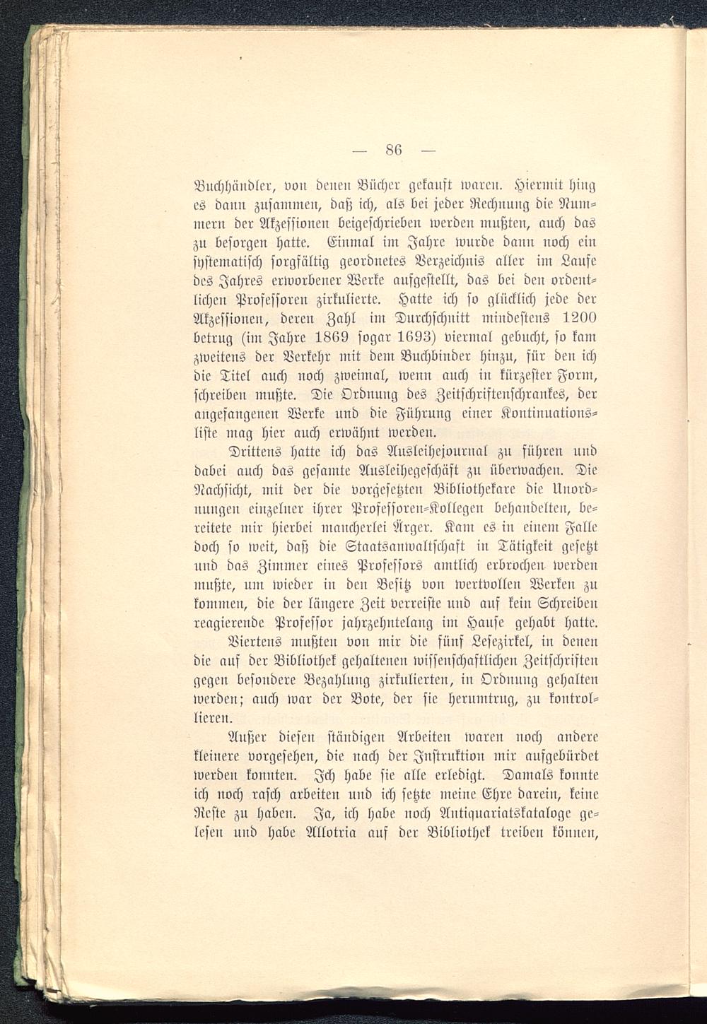 Buchhändler, von denen Bücher gekauft waren. Hiermit hinges dann zusammen, daß ich, als bei jeder Rechnung die Num-mern der Akzessioncn beigeschrieben werden mußten, auch daszu besorgen hatte. Einmal im Jahre wurde dann noch einsystematisch sorgfältig geordnetes Verzeichnis aller im Laufedes Jahres erworbener Werke aufgestellt, das bei den ordent-lichen Professoren zirkulierte. Hatte ich so glücklich jede derAkzessionen, deren Zahl im Durchschnitt mindestens 1200betrug (im Jahre 1869 sogar 1693) viermal gebucht, so kamzweitens der Verkehr mit dem Buchbinder hinzu, für den ichdie Titel auch noch zweimal, wenn auch in kürzester Form,schreiben mußte. Die Ordnung des Zeitschriftenschrankes, derangefangenen Werke und die Führung einer Kontinuations-liste mag hier auch erwähnt werden.