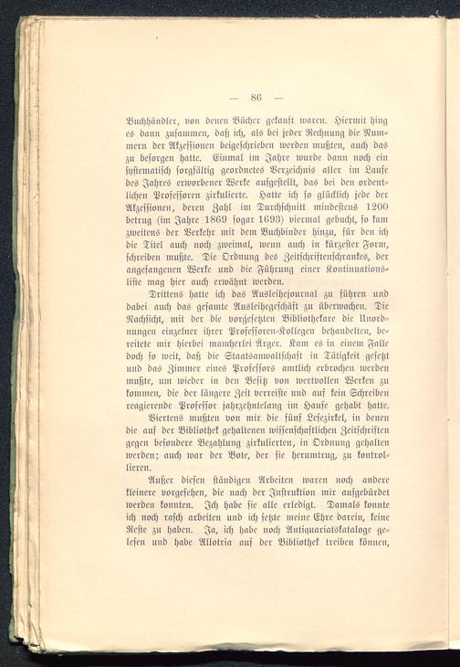 Außer diesen ständigen Arbeiten waren noch anderekleinere vorgesehen, die nach der Instruktion mir aufgebürdetwerden konnten. Ich habe sie alle erledigt. Damals konnteich noch rasch arbeiten und ich setzte meine Ehre darein, keineReste zu haben. Ja, ich habe noch Antiguariatskntaloge ge-lesen und habe Allotria auf der Bibliothek treiben können,