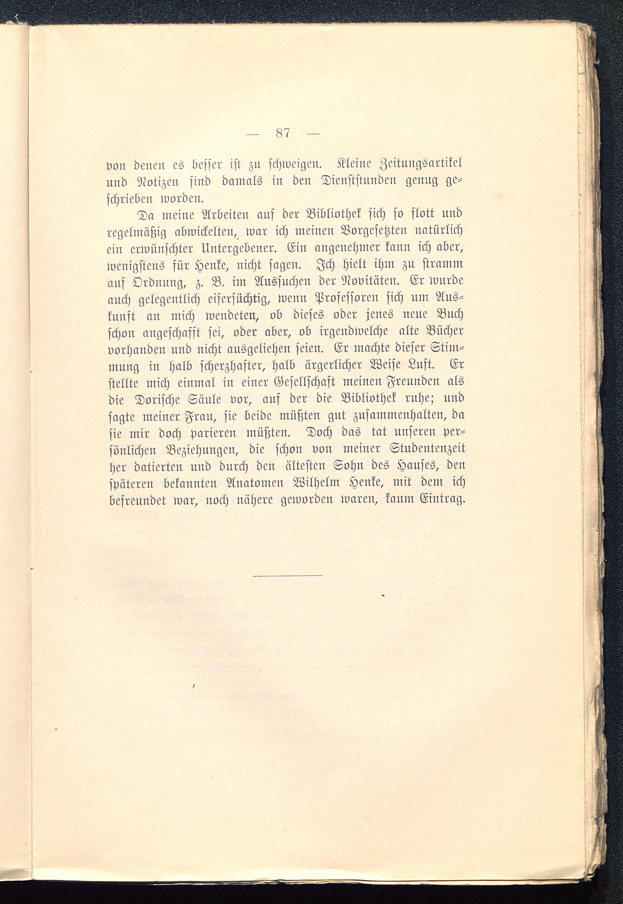 Da meine Arbeiten auf der Bibliothek sich so flott undregelmäßig abwickelten, war ich meinen Vorgesetzten natürlichein erwünschter Untergebener. Ein angenehmer kann ich aber,wenigstens für Henke, nicht sagen. Ich hielt ihm zu strammauf Ordnung, z. B. im Aussuchen der Novitäten. Er wurdeauch gelegentlich eifersüchtig, wenn Professoren sich um Aus-kunft an mich wendeten, ob dieses oder jenes neue Buchschon angeschafft sei, oder aber, ob irgendwelche alte Büchervorhanden und nicht ausgesehen seien. Er machte dieser Stim-mung in halb scherzhafter, halb ärgerlicher Weise Luft. Erstellte mich einmal in einer Gesellschaft meinen Freunden alsdie Dorische Säule vor, auf der die Bibliothek ruhe; undsagte meiner Frau, sie beide müßten gut zusammenhalten, dasie mir doch parieren müßten. Doch das tat unseren per-sönlichen Beziehungen, die schon von meiner Studentenzeither datierten und durch den ältesten Sohn des Hauses, denspäteren bekannten Anatomen Wilhelm Henke, mit dein ichbefreundet war, noch nähere geworden waren, kaum Eintrag.