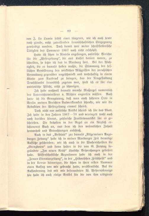 Auch in das „Beiblatt" znr damals „Allgemeinen Angs-bnrger Zeitung" habe ich in meiner Marbnrger Zeit derartigeAufsätze geschrieben; wie ich auch in die Wochenschriften die„Grenzboten" und dann später in die von G. Frehtag be-gründete „Im neuen Reich" ähnliche Besprechungen gelieferthabe. Wissenschaftliche Rezensionen habe ich auch in der„Jenaer Literatnrzeitung", in der „Historischen Zeitschrift" undin der R.evue lristoric^rie, die schon in ihrer ersten Nummereinen Aufsatz von mir gebracht hatte, veröffentlicht. Auf dieAufforderung des mit mir befreundeten W. Wehrenpfennigshin habe ich auch einige Artikel für die von ihm redigierte