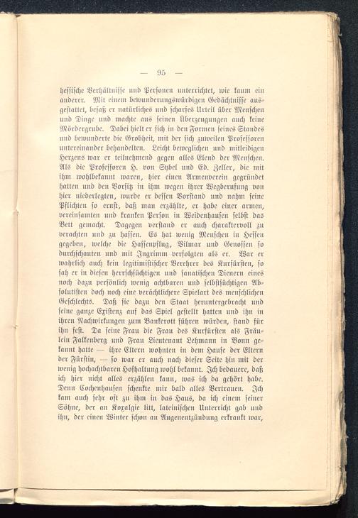 hessische Verhältnisse nnd Personen unterrichtet, wie knnm einanderer. Mit einen: bewunderungswürdigen Gedächtnisse aus-gestattet, besaß er natürliches und scharfes Urteil über Menschenund Dinge und machte aus seinen Überzeugungen auch keineMördergrube. Dabei hielt er sich in den Formen seines Standesund bewunderte die Grobheit, mit der sich zuweilen Professorenuntereinander behandelten. Leicht beweglichen und mitleidigenHerzens war er teilnehmend gegen alles Elend der Menschen.Als die Professoren H. von Sybel und Ed. Zelter, die mitihm wohlbekannt waren, hier einen Armenverein gegründethatten nnd den Vorsitz in ihm wegen ihrer Wegberufung vonhier niederlegten, wurde er dessen Vorstand und nahm seinePflichten so ernst, daß man erzählte, er habe einer armen,vereinsamten und kranken Persoi: in Weidenhausen selbst dasBett gemacht. Dagegen verstand er auch charaktervoll zuverachten und zu hassen. Es hat wenig Menschen in Hessen gegeben, welche die Hassenpflng, Vilmar und Genossen sodurchschauten und mit Ingrimm verfolgten als er. War erwahrlich auch kein legitimistischcr Verehrer des Kurfürsten, sosah er in diesen herrschsüchtigen und fanatischen Dienern einesnoch dazu persönlich wenig achtbaren nnd selbstsüchtigen Ab-solutsten doch noch eine verächtlichere Spielart des menschlichenGeschlechts. Daß sie dazu den Staat heruntergebracht undseine ganze Existenz auf das Spiel gestellt hatten und ihn inihren Nachwirkungen zum Bankerott führen würden, stand fürihn fest. Da seine Frau die Frau des Kurfürsten als Fräu-lein Falkenberg und Frau Lieutenant Lehman:: in Bonn ge-kannt hatte — ihre Eltern wohnten in den: Hanse der Elternder Fürstin, — so war er auch nach dieser Seite hin mit derwenig hochachtbaren Hofhaltung wohl bekannt. Ich bedauere, daßich hier nicht alles erzählen kann, was ich da gehört habe.Denn Cochcnhansen schenkte nur bald alles Vertrauen. Ichkam auch sehr oft zu ihm in das Hans, da ich einen: seinerSöhne, der an Koxalgie litt, lateinischen Unterricht gab undihn, der einen Winter schon an Augenentzündung erkrankt war.