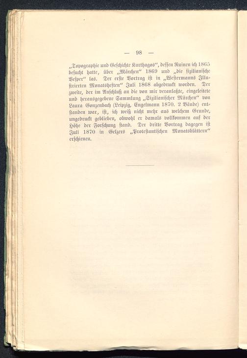 „Topographie und Geschichte Karthagos", dessen Ruinen ich 1805,besucht hatte, über „Märchen" 1869 und „die sizilianischeVesper" las. Der erste Vortrug ist in „Westermanns Illu-strierten Monatsheften" Juli 1868 abgedruckt worden. Derzweite, der im Anschluß an die von mir veranlaßte, eingeleiteteund herausgegebene Sammlung „Sizilianischer Märchen" vonLaura Gonzenbach (Leipzig, Engelmann 1870. 2 Bände) ent-standen war, ist, ich weiß nicht mehr aus welchem Grunde,ungcdruckt geblieben, obwohl er damals vollkommen auf derHöhe der Forschung stand. Der dritte Bortrag dagegen istJuli 1870 in Gelzers „Protestantischen Monatsblättern"erschienen.