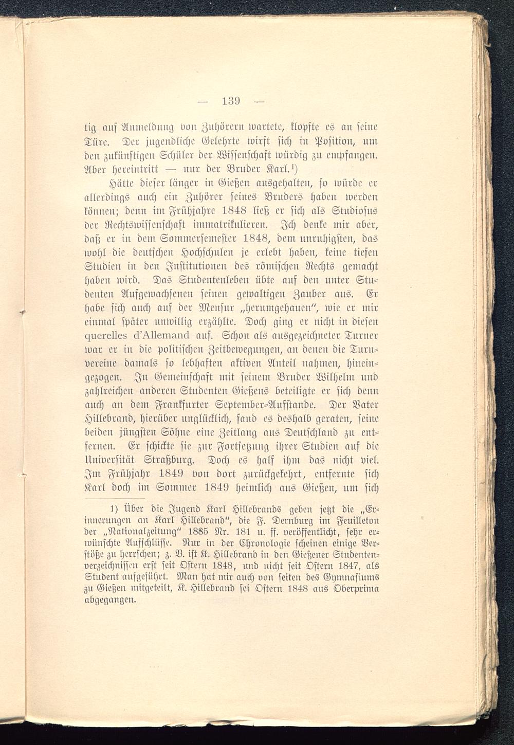Hätte dieser länger in Gießen ausgehalten, so würde erallerdings auch ein Zuhörer seines Bruders haben werdenkönnen; denn im Frühjahre 1848 ließ er sich als Studiosusder Rechtswissenschaft immatrikulieren. Ich denke mir aber,daß er in dem Sommersemcster 1848, dein unruhigsten, daswohl die deutschen Hochschulen je erlebt haben, keine tiefenStudien in den Institutionen des römischen Rechts gemachthaben wird. Das Stndentenleben übte auf den unter Stu-denten Aufgewachsenen seinen gewaltigen Zauber aus. Erhabe sich auch auf der Mensur „herumgehanen", wie er mireinmal später unwillig erzählte. Doch ging er nicht in diesen<guerelles cl'^llemaircl auf. Schon als ausgezeichneter Turnerwar er in die politischen Zeitbewegungen, an denen die Turn-vereine damals so lebhaften aktiven Anteil nahmen, hinein-gezogen. In Gemeinschaft mit seinem Bruder Wilhelm undzahlreichen anderen Studenten Gießens beteiligte er sich dennauch an den: Frankfurter Scptember-Aufstande. Der VaterHillebrand, hierüber unglücklich, fand es deshalb geraten, seinebeiden jüngsten Söhne eine Zeitlang aus Deutschland zu ent-fernen. Er schickte sie znr Fortsetzung ihrer Studien auf dieUniversität Straßbnrg . Doch es half ihm das nicht viel.Im Frühjahr 1849 von dort zurückgekehrt, entfernte sichKarl doch im Sommer 1849 heimlich aus Gießen , um sich