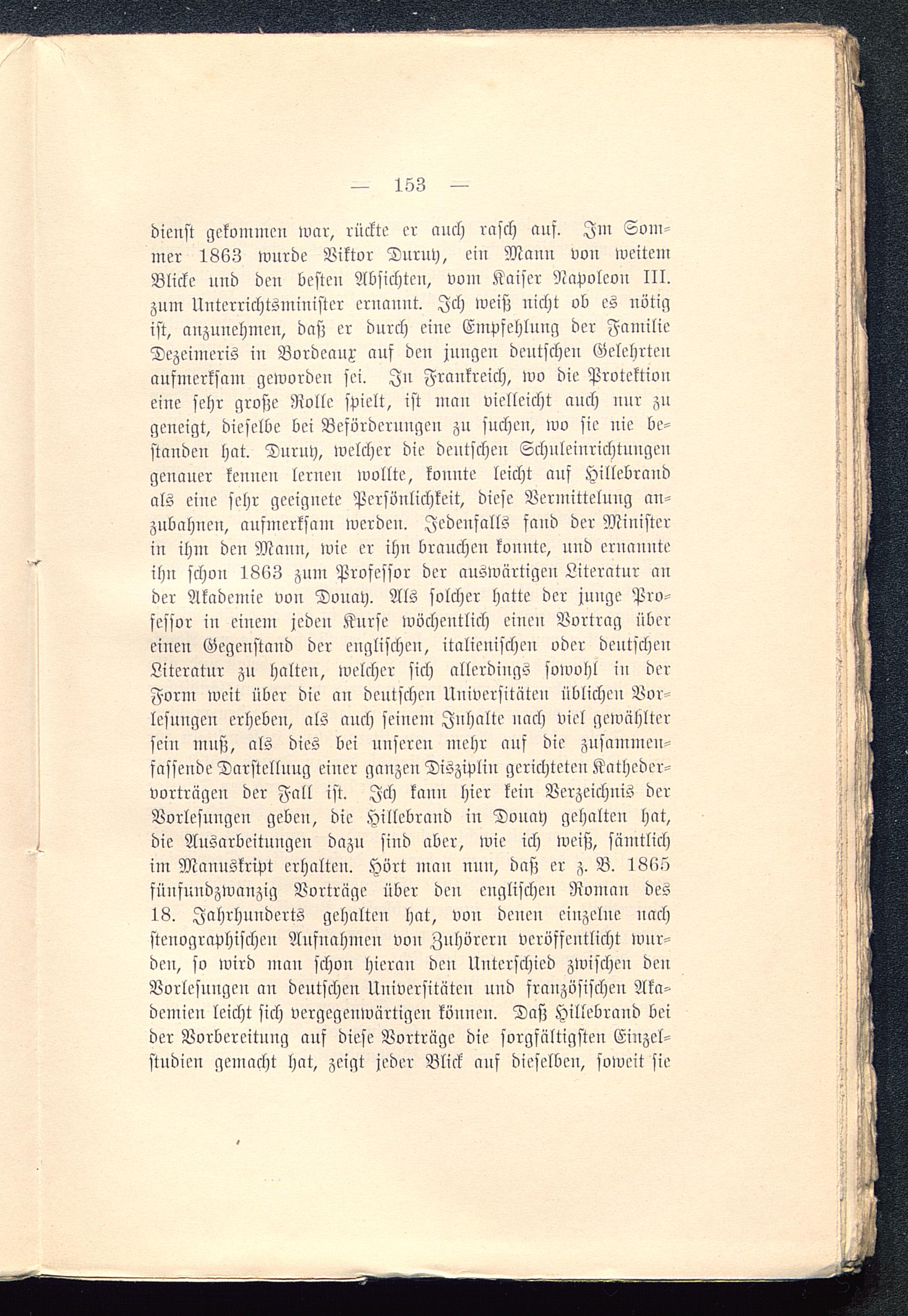 dienst gekommen war, rückte er anch rasch anf. Im Som-mer 1863 wnrde Viktor Duruy, ein Mann von weitemBlicke nnd den besten Absichten, vvm Kaiser Napoleon III. zum Untcrrichtsminister ernannt. Ich weiß nicht ob es nötigist, anzunehmen, daß er durch eine Empfehlung der FamilieDezeimeris in Bordeaux auf den jungen deutschen Gelehrtenaufmerksam geworden sei. In Frankreich , wo die Protektioneine sehr große Rolle spielt, ist man vielleicht auch nur zugeneigt, dieselbe bei Beförderungen zu suchen, wo sie nie be-standen hat. Duruy, welcher die deutschen Schuleinrichtungengenauer kennen lernen wollte, konnte leicht auf Hillebrandals eine sehr geeignete Persönlichkeit, diese Vermittelung an-zubahnen, aufmerksam werden. Jedenfalls fand der Ministerin ihm den Mann, wie er ihn brauchen konnte, nnd ernannteihn schon 1863 zum Professor der auswärtigen Literatur ander Akademie von Donay. Als solcher hatte der junge Pro-fessor in einem jeden Kurse wöchentlich einen Vortrag übereinen Gegenstand der englischen, italienischen oder deutschenLiteratur zu halten, welcher sich allerdings sowohl in derForm weit über die an deutschen Universitäten üblichen Vor-lesungen erheben, als anch seinem Inhalte nach viel gewähltersein muß, als dies bei unseren mehr anf die zusammen-fassende Darstellung einer ganzen Disziplin gerichteten Katheder-vorträgen der Fall ist. Ich kann hier kein Verzeichnis derVorlesungen geben, die Hillebrand in Donay gehalten hat,die Ausarbeitungen dazu sind aber, wie ich weiß, sämtlichim Manuskript erhalten. Hört man nun, daß er z. B. 1865fünfundzwanzig Vortrüge über den englischen Roman des18. Jahrhunderts gehalten hat, von denen einzelne nachstenographischen Aufnahmen von Zuhörern veröffentlicht wur-den, so wird man schon hieran den Unterschied zwischen denVorlesungen an deutschen Universitäten und französischen Aka-demien leicht sich vergegenwärtigen können. Daß Hillebrand beider Vorbereitung auf diese Vortrage die sorgfältigsten Einzel-studien gemacht hat, zeigt jeder Blick anf dieselben, soweit sie