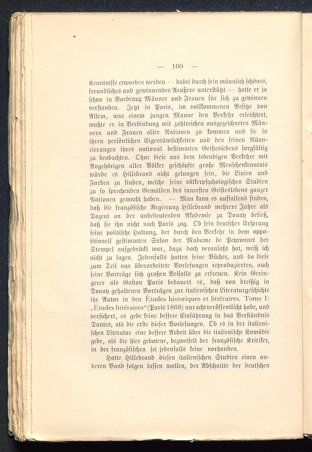 Kenntnisse erworben werden dabei durch sein männlich schönes,freundliches und gewinnendes Aeußere unterstützt — hatte er jaschon in Bordeaux Männer und Frauen für sich zu gewinnenverstanden. Jetzt in Paris , im vollkommenen Besitze vonAllem, was einem jungen Manne den Verkehr erleichtert,wusste er in Verbindung mit zahlreichen ausgezeichneten Män-nern und Frauen aller Nationen zu kommen und sie inihren persönlichen Eigentümlichkeiten und den feinen Nüan-cicrnngen ihres national bestimmten Geisteslebens sorgfältigzu beobachten. Ohne diese aus dem lebendigen Verkehre mitAngehörigen aller Völker geschöpfte große Menschenkenntniswürde es Hillebrand nicht gelungen sein, die Linien undFarben zu finden, welche seine Völkerpsychologischen Studienzu so sprechenden Gemälden des innersten Geisteslebens ganzerNationen gemacht haben. — Man kann es auffallend finden,daß die französische Regierung Hillebrand mehrere Jahre alsDozent an der unbedeutenden Akademie zu Donay beließ,daß sie ihn nicht nach Paris zog. Ob sein deutscher Ursprungseine Politische Haltung, der durch den Verkehr in dem oppo-sitionell gestimmten Salon der Madame de Peyronnet derStempel aufgedrückt war, dazu doch veranlaßt hat, weiß ichnicht zu sagen. Jedenfalls hatten seine Bücher, und da diesezum Teil nur überarbeitete Vorlesungen reproduzierten, auchseine Vortrüge sich großen Beifalls zu erfreuen. Kein Gerin-gerer als Gaston Paris bedauert es, daß von dreißig inDonay gehaltenen Vortragen zur italienischen Literaturgeschichteihr Autor in den ststuckes Iristorchues et litteraires. Dorne I:„Dtnckeg litternires" (Paris 1868) nur acht veröffentlicht habe, undversichert, es gebe keine bessere Einführung in das VerständnisDantes, als die erste dieser Vorlesungen. Ob es in der italieni-schen Literatur eine bessere Arbeit über die italienische Komödiegebe, als die hier gebotene, bezweifelt der französische Kritiker,in der französischen sei jedenfalls keine vorhanden.