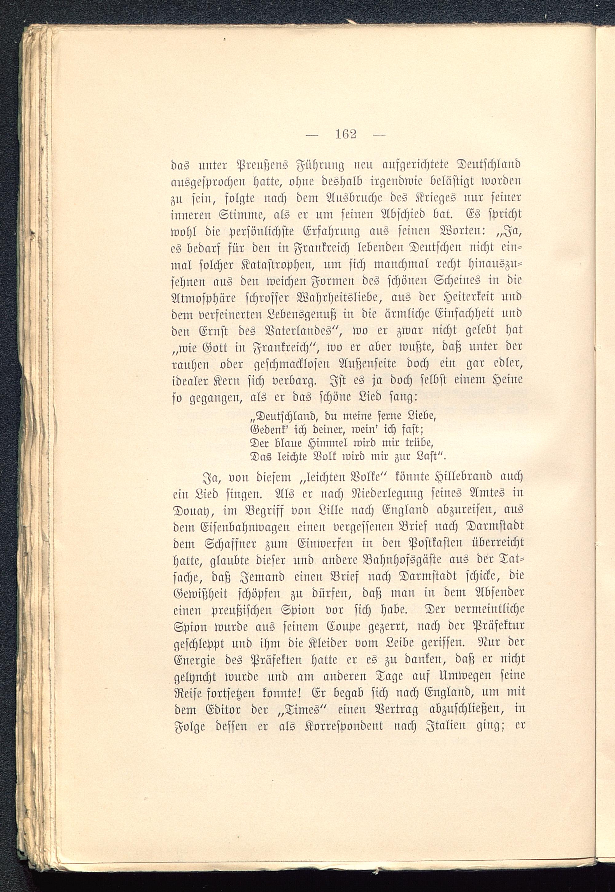 Ja, von diesem „leichten Volke" könnte Hitlebrand auchein Lied singen. Als er nach Niederlegung seines Amtes inDouay, im Begriff von Lille nach England abzureisen, ausdem Eisenbahnwagen einen vergessenen Brief nach Darmstadt dem Schaffner znm Einwerfen in den Postkasten überreichthatte, glaubte dieser und andere Bahnhofsgäste aus der Tat-sache, daß Jemand einen Brief nach Darmstadt schicke, dieGewißheit schöpfen zu dürfen, daß man in dem Absendereinen preußischen Spion vor sich habe. Der vermeintlicheSpion wurde aus seinem Coupe gezerrt, nach der Präfektnrgeschleppt und ihm die Kleider vom Leibe gerissen. Nur derEnergie des Präfekten hatte er es zu danken, daß er nichtgelyncht wurde und am anderen Tage auf Umwegen seineReise fortsetzen konnte! Er begab sich nach England , um mitdem Editor der „Times" einen Vertrag abzuschließen, inFolge dessen er als Korrespondent nach Italien ging; er