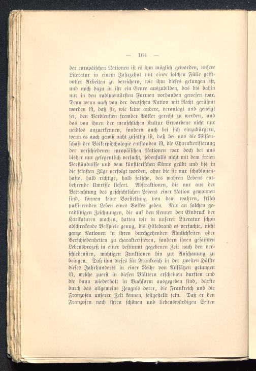 der europäischen Nationen ist es ihm möglich geworden, unsereLiteratur in einem Jahrzehnt mit einer solchen Fülle geist-voller Arbeiten zu bereichern, wie ihm dieses gelungen ist,und noch dazu in ihr ein Genre auszubilden, das bis dahinnur in den rudimentärsten Formen vorhanden gewesen war.Denn wenn auch von der deutschen Nation mit Recht gerühmtworden ist, das; sie, wie keine andere, veranlagt und geneigtsei, den Verdiensten fremder Völker gerecht zu werden, unddas von ihnen der menschlichen Kultur Erworbene nicht nurneidlos anzuerkennen, sondern auch bei sich einzubürgern,wenn es auch gewiß nicht zufällig ist, daß bei uns die Wissen-schaft der Völkerpsychologie entstanden ist, die Charakterisierungder verschiedenen europäischen Nationen war doch bei unsbisher nur gelegentlich versucht, jedenfalls nicht mit dem freienVerständnisse und dem künstlerischen Sinne geübt und bis indie feinsten Züge verfolgt worden, ohne die sie nur schablonen-hafte, halb richtige, halb falsche, des wahren Lebens ent-behrende Umrisse liefert. Abstraktionen, die nur ans derBetrachtung des geschichtlichen Lebens einer Nation gewonnensind, können keine Vorstellung von dem wahren, frischpulsierenden Leben eines Volkes geben. Nur an solchen ge-radlinigen Zeichnungen, die auf den Kenner den Eindruck derKarikaturen machen, hatten wir in unserer Literatur schonabschreckende Beispiele genug, bis Hillcbrand es versuchte, nichtganze Nationen in ihren durchgehenden Ähnlichkeiten oderVerschiedenheiten zu charakterisieren, sondern ihren gesamtenLebensprozeß in einer bestimmt gegebenen Zeit nach den ver-schiedensten, wichtigen Funktionen hin zur Anschauung zubringen. Daß ihm dieses für Frankreich in der zweiten Hälftedieses Jahrhunderts in einer Reihe von Aufsätzen gelungenist, welche zuerst in diesen Blättern erscheinen durften unddie dann wiederholt in Buchform ausgegeben sind, dürftedurch das allgemeine Zeugnis derer, die Frankreich und dieFranzosen unserer Zeit kennen, festgestellt sein. Daß er denFranzosen nach ihren schönen und liebenswürdigen Seiten
