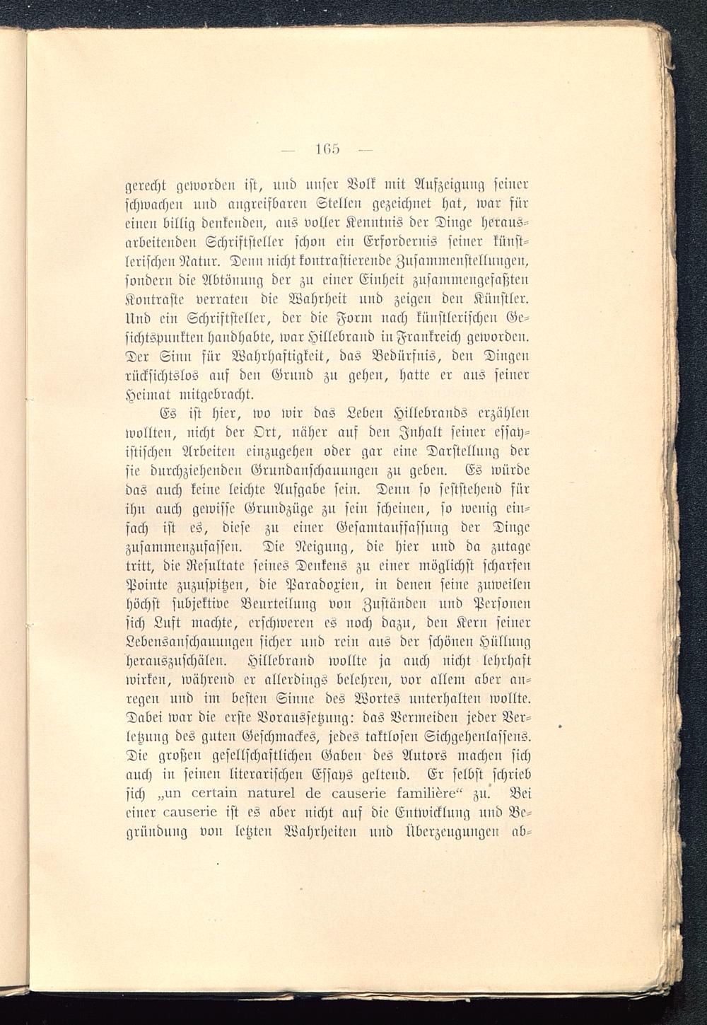 Es ist hier, wo wir das Leben Hillebrands erzählenwollten, nicht der Ort, näher auf den Inhalt seiner essay-istischen Arbeiten einzugehen oder gar eine Darstellung dersie durchziehenden Grundanschaunngcn zu geben. Es würdedas auch keine leichte Aufgabe sein. Denn so feststehend fürihn auch gewisse Grnndzüge zu sein scheinen, so wenig ein-fach ist es, diese zu einer Gesamtanffassnng der Dingezusammenzufassen. Die Neigung, die hier und da zutagetritt, die Resultate seines Denkens zu einer möglichst scharfenPointe zuzuspitzen, die Paradoxien, in denen seine zuweilenhöchst subjektive Beurteilung von Zuständen und Personensich Luft machte, erschweren es noch dazu, den Kern seinerLebensanschaunngen sicher und rein aus der schönen Hülluugherauszuschälen. Hillebrand wollte ja auch nicht lehrhaftwirken, während er allerdings belehren, vor allem aber an-regen und im besten Sinne des Wortes unterhalten wollte.Dabei war die erste Voraussetzung: das Vermeiden jeder Ver-letzung des guten Geschmackes, jedes taktlosen Sichgehenlassens.Die großen gesellschaftlichen Gaben des Autors machen sichauch in seinen literarischen Essays geltend. Er selbst schriebsich „uir cerlmiir imturek cke cuuserie kairüliere" zu. Beieiner cuuserie ist es aber nicht auf die Entwicklung und Be-gründung von letzten Wahrheiten und Überzeugungen ab-