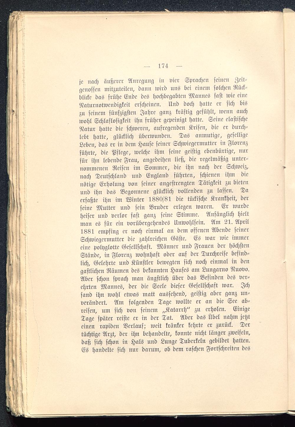 je nach äußerer Anregung in vier Sprachen seinen Zeit-genossen mitzuteilen, dann wird uns bei einen: solchen Rück-blicke das frühe Ende des hochbegabten Mannes fast wie eineNaturnotwendigkeit erscheinen, lind doch hatte er sich biszu seinem fünfzigsten Jahre ganz kräftig gefühlt, wenn auchwohl Schlaflosigkeit ihn früher gepeinigt hatte. Seine elastischeNatur hatte die schweren, aufregenden Krisen, die er durch-lebt hatte, glücklich überwunden. Das anmutige, geselligeLeben, das er in dem Hause seiner Schwiegermutter in Florenz führte, die Pflege, welche ihm seine geistig ebenbürtige, nurfür ihn lebende Frau, angedeihen ließ, die regelmäßig unter-nommenen Reisen im Sommer, die ihn nach der Schweiz ,nach Deutschland und England führten, schienen ihm dienötige Erholung von seiner angestrengten Tätigkeit zu bietenund ihn das Begonnene glücklich vollenden zu lassen. Daerfaßte ihn im Winter 1880/81 die tückische Krankheit, derseine Mutter und sein Bruder erlegen waren. Er wurdeheiser und verlor fast ganz seine Stimme. Anfänglich hieltman es für ein vorübergehendes Unwohlsein. Am 21. April1881 empfing er noch einmal an dem offenen Abende seinerSchwiegermutter die zahlreichen Gäste. Es war wie immereine Polyglotte Gesellschaft. Männer und Frauen der höchstenStände, in Florenz wohnhaft oder auf der Durchreise befind-lich, Gelehrte und Künstler bewegten sich noch einmal in dengastlichen Räumen des bekannten Hauses an: Luugaruo Nuovo.Aber schon sprach mau ängstlich über das Befinden des ver-ehrten Mannes, der die Seele dieser Gesellschaft war. Ichfand ihn wohl etwas matt aussehend, geistig aber ganz un-verändert. Am folgenden Tage wollte er an die See ab-reisen, um sich von seinem „Katarrh" zu erholen. EinigeTage später reiste er in der Tat. Aber das Übel nahm jetzteinen rapiden Verlauf; weit kränker kehrte er zurück. Dertüchtige Arzt, der ihn behandelte, konnte nicht länger zweifeln,daß sich schon in Hals und Lunge Tuberkeln gebildet hatten.Es handelte sich nur darum, ob dem raschen Fortschreiten des