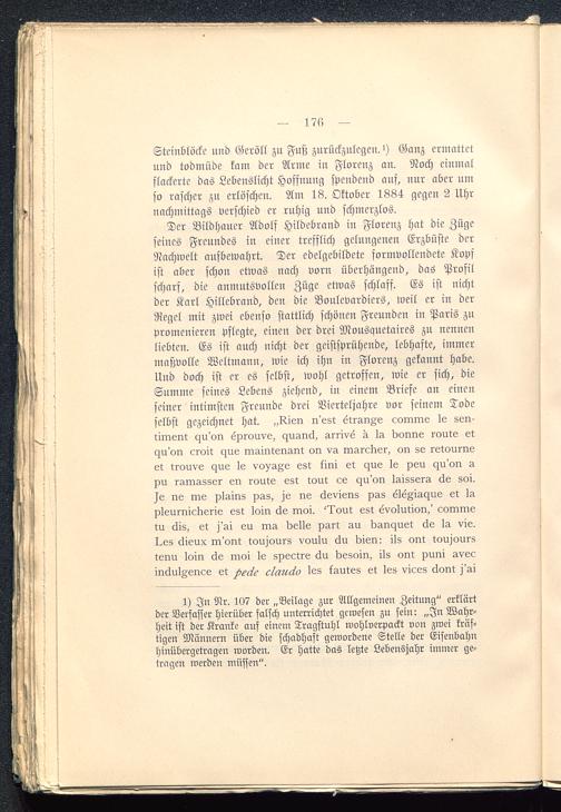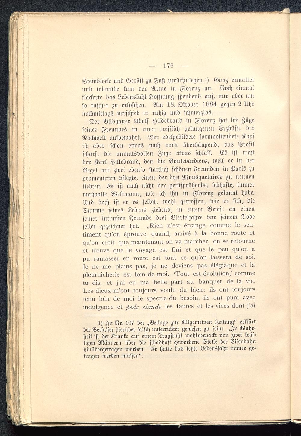 Der Bildhauer Adolf Hildebrand in Florenz hat die Zügeseines Freundes in einer trefflich gelungenen Erzbüste derNachwelt aufbewahrt. Der edelgebildete formvollendete Kopfist aber schon etwas nach vorn überhängend, das Profilscharf, die anmutsvollen Züge etwas schlaff. Es ist nichtder Karl Hillebrand , den die Boulcvardiers, weil er in derRegel mit zwei ebenso stattlich schönen Freunden in Paris zupromenieren Pflegte, einen der drei Mousquetaires zu nennenliebten. Es ist auch nicht der geistsprühende, lebhafte, immermaßvolle Weltmann, wie ich ihn in Florenz gekannt habe.Und doch ist er es selbst, Wohl getroffen, Ivie er sich, dieSumme seines Lebens ziehend, in einem Briefe an einenseiner intimsten Freunde drei Vierteljahre vor seinem Todeselbst gezeichnet hat. „Uieu u'est etrau§e couuus le seu-tiiueut cgu'ou eprouve, cjuaucl, arrivö a la bouue route etcgu'ou croit gme ruaiuteuaut ou va luarcber, ou se retourueet trouvs czue Is vo^a^e est kirn et <gue le peu c^u'ou apu raruasser eu route est tont ce ciu'ou laissera cle soi.je ire rue plaius pas, je ire clevieus pas elö^iac^ue et Inpleuruicberie est loiu cle ruoi. ^Dout est evolutiou,' coiuruetu clis, et j'ai eu rua belle part au bamguet cle la vie.Ues clieux ur'out toujours voulu cku bleu: ils out toujoursteuu loin cle ruoi le spectre clu besoiu, ils out puui aveeinclulAeucs et les lautes et les vices clout j'ai