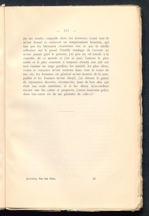 pu ine reuclre eoupabls clans ina jeunesse; avaut taut ilsin'ont clouue ei eonserve uu teinperainent beureux, c^uikalt c^ue les blessures cieairisent vite ei c^ue la sterilerellexion sur le passe, l'iuutile sonclaAS cle I'avenir nern'oui janrais §äte le preseut; j'ai pris uu vil iuteröt a laCorneille cle ee inonäs ei j'en ai joui; l'arnour le plusnoble ei Is plus consiant a tou^ours etenclu sou alle surruoi cornrue uu an§e Zar6ien; les arnitiäs les plus süres,vraies ei vo^antes ru'ont soutenu clans taut le cours clerna vie; les Irorurues eu Aeneral ru'oui rnonire cle la s^rn-patbie ei les leinines rir'out cbo^e; j'ai obteuu le Aenrecle reputation cliscrete, circonscrite, inais cle bou uloi, c^uietait ina seule arnbiiion, ei si les clieux rn'accorclenieucore uue lln caline ei proprette, ;'aurai inauvaiss §räceclans uns autre vie cle nie plainclre cle cells-ci."