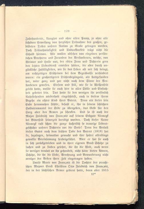 Jahrhunderts, klanglos und ohne allen Pomp, ja ohne allesichtbare Erweisung von herzlicher Teilnahme des großen, ge-bildeten Teiles unserer Nation zu Grabe getragen worden.Doch Teilnahmlosigkeit und Undankbarkeit trägt nicht dieSchuld hiervon. Wir wollen absehen von einzelnen persön-lichen Verehrern und Freunden der Verstorbenen, welche, vonWeimar und Halle aus, der edlen Frau und Dichterin gernden letzten Liebesdienst erwiesen Hütten, die aber durch un-glückliche Zufälligkeiten, wie sie das Leben oft mit sich bringt,am rechtzeitigen Erscheinen bei dem Begräbnisse verhindertwaren: ein großartigeres Leichenbegängnis, als stattgefundenhat, wäre ganz und gar nicht nach dem Sinne der Ver-storbenen gewesen. Einsam und still, wie sie in Weißenfels gelebt hatte, wollte sie auch hier in aller Stille und Einfach-heit gebettet sein. Das hatte sie den wenigen ihr persönlichNahestehenden wiederholt eingeschärft, auch in diesem ihremBegehr ein echtes Kind ihres Vaters. Denn als dieser seinEnde herannahen fühlte, befahl er, ihn in seinem schlichtenSoldatenmantel der Erde zu übergeben, das Geld für denSarg aber den Armen zu schenken. Und so ist auch der