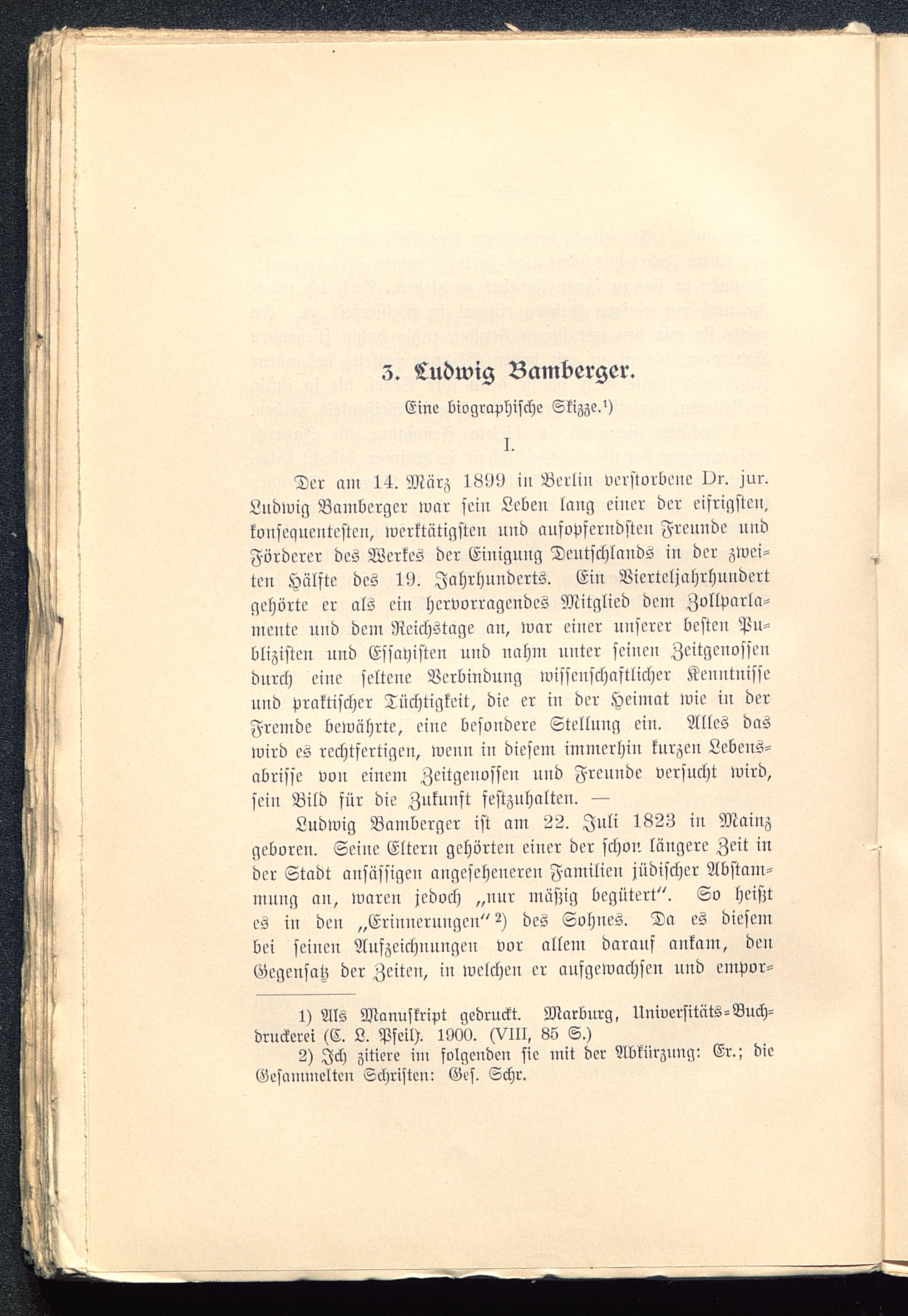 Ludwig Bamberger ist am 22. Juli 1823 in Mainz geboren. Seine Eltern gehörten einer der schon längere Zeit inder Stadt ansässigen angeseheneren Familien jüdischer Abstam-mung an, waren jedoch „nur müßig begütert". So heißtes in den „Erinnerungen" 2) des Sohnes. Da es diesembei seinen Aufzeichnungen vor allem darauf ankam, denGegensatz der Zeiten, in welchen er aufgewachsen und empor-