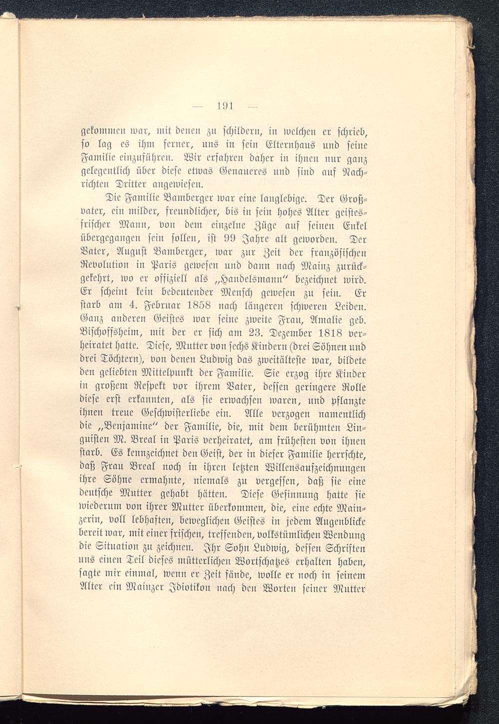 Die Familie Bamberger war eine langlebige. Der Groß-vater, ein milder, freundlicher, bis in sein hohes Alter geistes-frischer Mann, von dem einzelne Züge auf seinen Enkelübergegangen sein sollen, ist 99 Jahre alt geworden. DerVater, August Bamberger, war zur Zeit der französischenRevolution in Paris gewesen und dann nach Mainz zurück-gekehrt, wo er offiziell als „Handelsmann" bezeichnet wird.Er scheint kein bedeutender Mensch gewesen zu sein. Erstarb am 4. Februar 1858 nach längeren schweren Leiden.Ganz anderen Geistes war seine zweite Frau, Amalie geb.Bischoffshcim, mit der er sich am 23. Dezember 1818 ver-heiratet hatte. Diese, Mutter von sechs Kindern (drei Söhnen unddrei Töchtern), von denen Ludwig das Zweitälteste war, bildeteden geliebten Mittelpunkt der Familie. Sie erzog ihre Kinderin großem Respekt vor ihrem Vater, dessen geringere Rollediese erst erkannten, als sie erwachsen waren, und pflanzteihnen treue Geschwisterliebc ein. Alle verzogen namentlichdie „Benjaminc" der Familie, die, mit dem berühmten Lin-guisten M. Breal in Paris verheiratet, am frühesten von ihnenstarb. Es kennzeichnet den Geist, der in dieser Familie herrschte,daß Frau Breal noch in ihren letzten Willensaufzeichnungenihre Söhne ermähnte, niemals zu vergessen, daß sie einedeutsche Mutter gehabt hätten. Diese Gesinnung hatte siewiederum von ihrer Mutter überkommen, die, eine echte Main-zern:, voll lebhaften, beweglichen Geistes in jedem Augenblickebereit war, mit einer frischen, treffenden, volkstümlichen Wendungdie Situation zu zeichnen. Ihr Sohn Ludwig, dessen Schriftenuns einen Teil dieses mütterlichen Wortschatzes erhalten haben,sagte mir einmal, wenn er Zeit fände, wolle er noch in seinemAlter ein Mainzer Idiotikon nach den Worten seiner Mutter