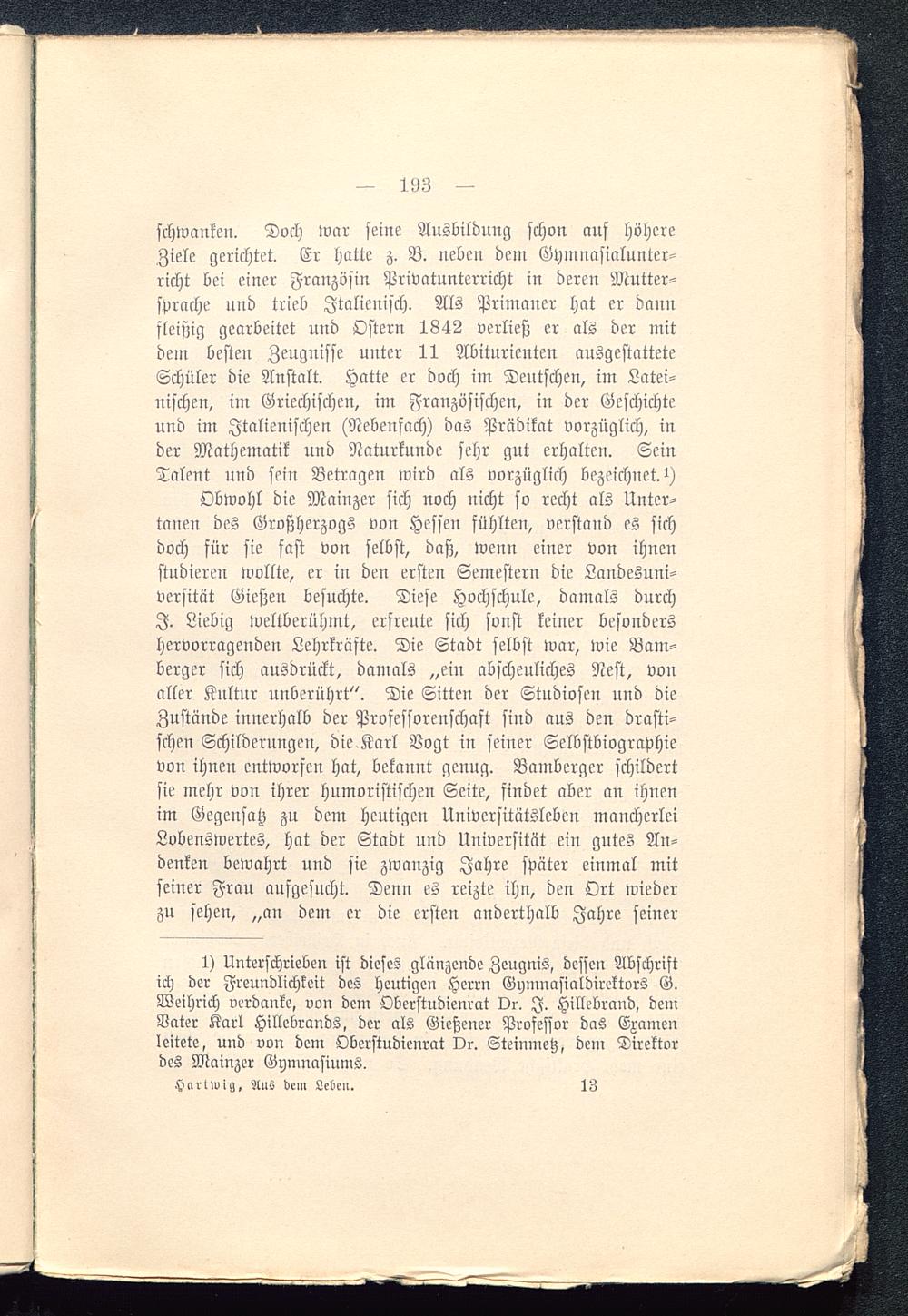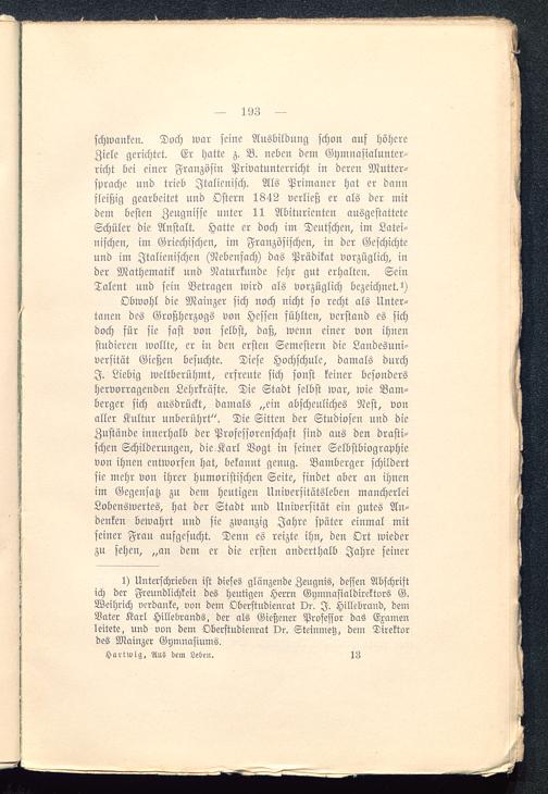 1) Unterschrieben ist dieses glänzende Zeugnis, dessen Abschriftich der Freundlichkeit des heutigen Herrn Gymnasialdirektors G.Weihrich verdanke, von dem Oberstudienrat Dr. I. Hillebrand, demVater Karl Hillebrands, der als Gießener Professor das Examenleitete, und von dem Oberstudienrat Dr. Steinmetz, dem Direktordes Mainzer Gymnasiums.