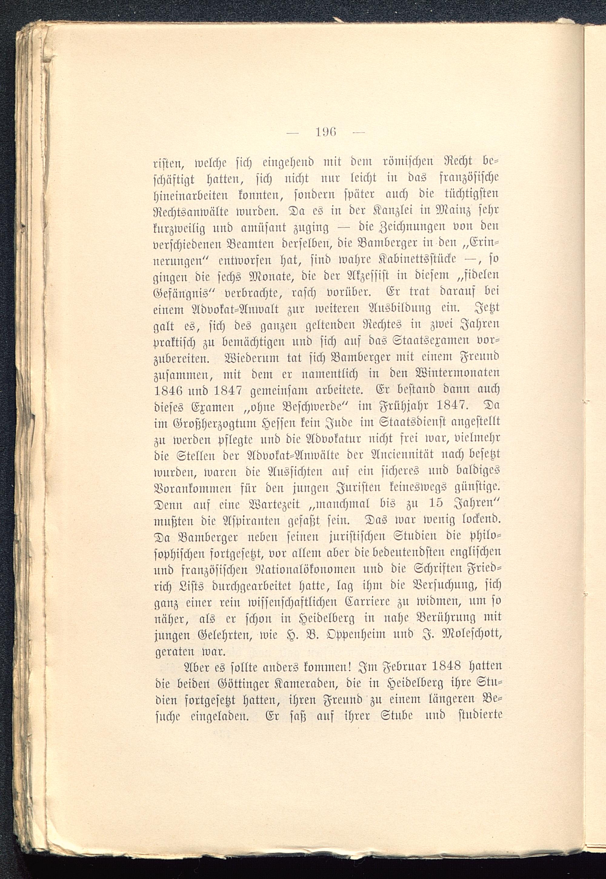risten, welche sich eingehend mit dem römischen Recht be-schäftigt hatten, sich nicht mir leicht in das französischehineinarbeiten konnten, sondern spater auch die tüchtigstenRcchtsanwälte wurden. Da es in der Kanzlei in Mainz sehrkurzweilig und amüsant zuging — die Zeichnungen von denverschiedenen Beamten derselben, die Bamberger in den „Erin-nerungen" entworfen hat, sind wahre Kabinettsstücke —, sogingen die sechs Monate, die der Akzessist in diesem „fidelenGefängnis" verbrachte, rasch vorüber. Er trat darauf beieinem Advokat-Anwalt zur weiteren Ausbildung ein. Jetztgalt es, sich des ganzen geltenden Rechtes in zwei Jahrenpraktisch zu bemächtigen und sich auf das Staatsexamen vor-zubereiten. Wiederum tat sich Bamberger mit einem Freundzusammen, mit dein er namentlich in den Wintermonaten1846 und 1847 gemeinsam arbeitete. Er bestand dann auchdieses Examen „ohne Beschwerde" im Frühjahr 1847. Daim Großherzogtum Hessen kein Jude ine Staatsdienst angestelltzu werden Pflegte und die Advokatur nicht frei war, vielmehrdie Stellen der Advokat-Anwälte der Anciennität nach besetztwurden, waren die Aussichten auf ein sicheres und baldigesVorankommen für den jungen Juristen keineswegs günstige.Denn auf eine Wartezeit „manchmal bis zu 15 Jahren"mußten die Aspiranten gefaßt sein. Das war wenig lockend.Da Bamberger neben seinen juristischen Studien die philo-sophischen fortgesetzt, vor allein aber die bedeutendsten englischenund französischen Nationalökonomcu und die Schriften Fried-rich Lifts durchgearbeitet hatte, lag ihm die Versuchung, sichganz einer rein wissenschaftlichen Carriere zu widmen, um sonäher, als er schon in Heidelberg in nahe Berührung mitjungen Gelehrten, wie H. B. Oppenheim und I. Moleschott,geraten war.