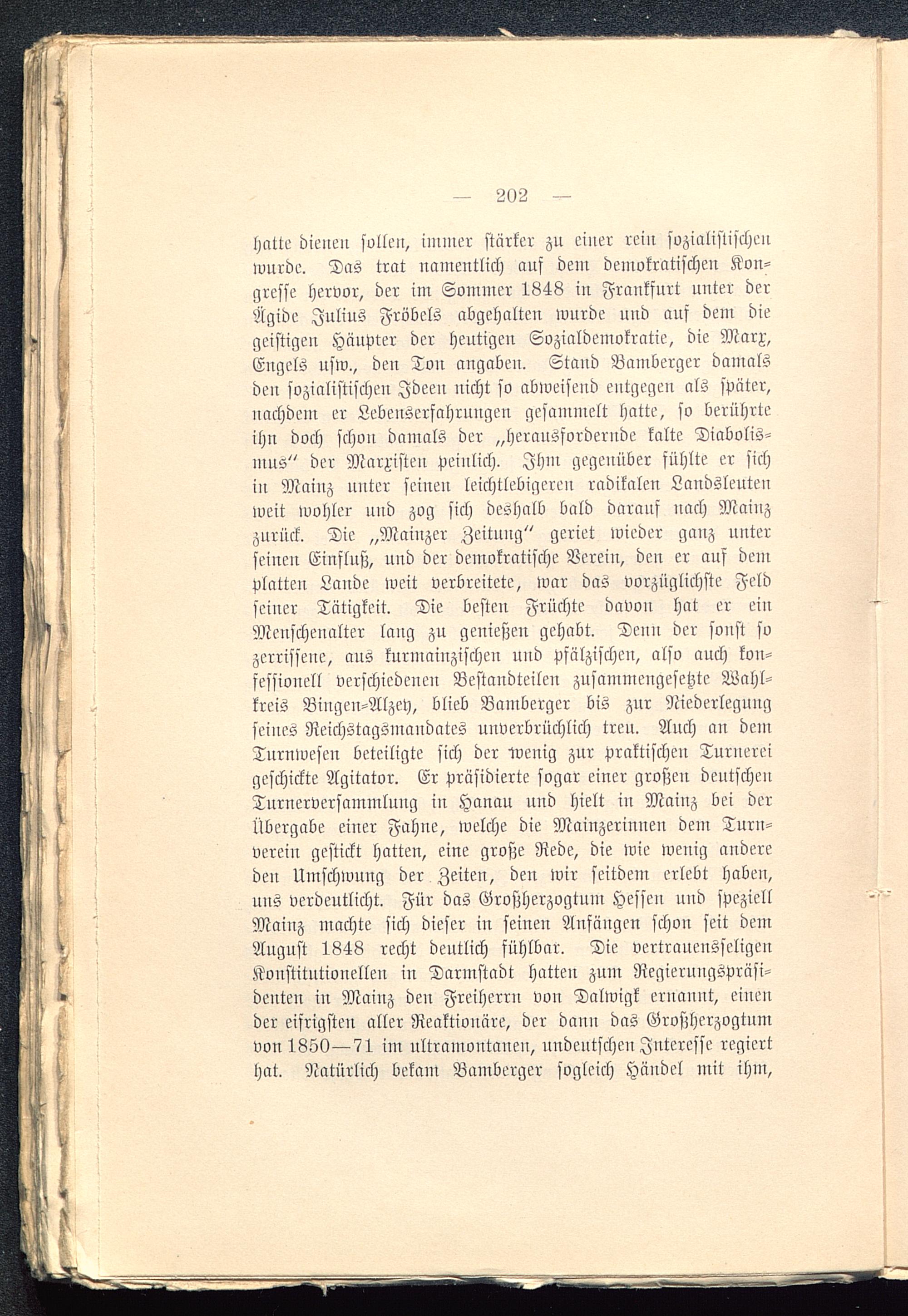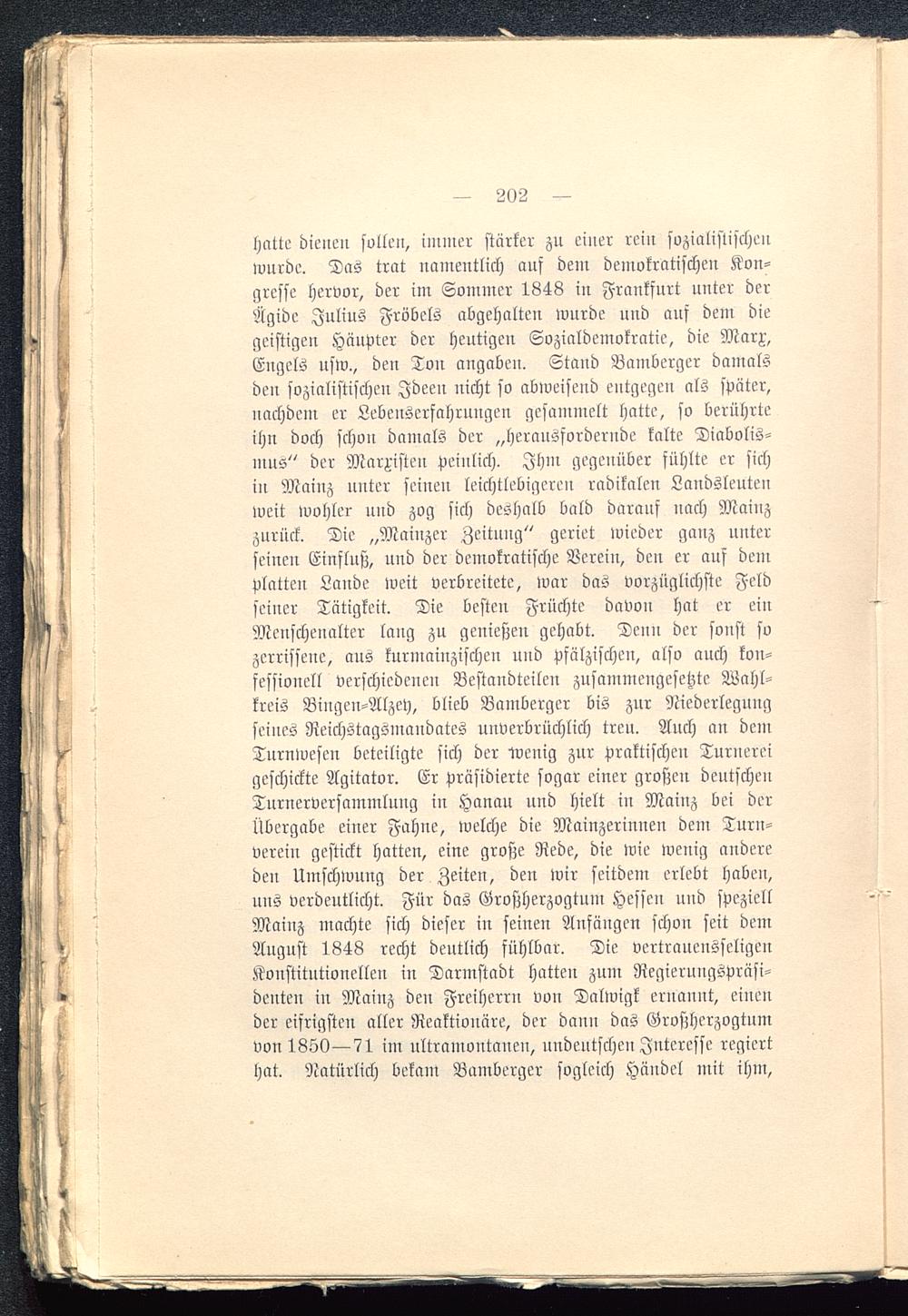 hatte dienen sollen, immer stärker zu einer rein sozialistischenwurde. Das trat namentlich auf dem demokratischen Kon-gresse hervor, der im Sommer 1848 in Frankfurt unter derÄgide Julius Fröbels abgehalten wurde und auf dem diegeistigen Häupter der heutigen Sozialdemokratie, die Marx,Engels usw., den Ton angaben. Stand Bamberger damalsden sozialistischen Ideen nicht so abweisend entgegen als später,nachdem er Lebenserfahrungen gesammelt hatte, so berührteihn doch schon damals der „herausfordernde kalte Diabolis-mns" der Marxisten peinlich. Ihm gegenüber fühlte er sichin Mainz unter seinen leichtlebigeren radikalen Landsleutenweit wohler und zog sich deshalb bald darauf nach Mainz zurück. Die „Mainzer Zeitung" geriet wieder ganz unterseinen Einfluß, und der demokratische Verein, den er auf demplatten Lande weit verbreitete, Ivar das vorzüglichste Feldseiner Tätigkeit. Die besten Früchte davon hat er einMenschenalter laug zu genießen gehabt. Denn der sonst sozerrissene, aus kurmaiuzischen und pfälzischen, also auch kon-fessionell verschiedenen Bestandteilen zusammengesetzte Wahl-kreis Bingen-Alzey , blieb Bamberger bis zur Niederlegungseines Reichstagsmaudates unverbrüchlich treu. Auch an demTurnwescn beteiligte sich der loenig zur praktischen Turnereigeschickte Agitator. Er präsidierte sogar einer großen deutschenTurnerversammlung in Hanau und hielt in Mainz bei derÜbergabe einer Fahne, welche die Mainzerinnen dem Turn-verein gestickt hatten, eine große Rede, die wie wenig andereden Umschwung der Zeiten, den wir seitdem erlebt haben,uns verdeutlicht. Für das Großherzogtum Hessen und speziellMainz machte sich dieser in seinen Anfängen schon seit demAugust 1848 recht deutlich fühlbar. Die vertrauensseligenKonstitutionellen in Darmstadt hatten zum Regierungspräsi-denten in Mainz den Freiherrn von Dalwigk ernannt, einender eifrigsten aller Reaktionäre, der dann das Großherzogtumvon 1850—71 im ultramontauen, undeutscheu Interesse regierthat. Natürlich bekam Bamberger sogleich Händel mit ihm,