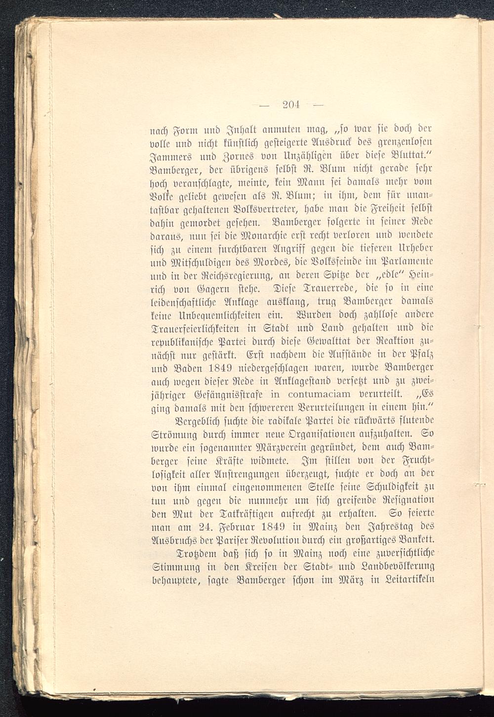Vergeblich suchte die radikale Partei die rückwärts flutendeStrömung durch immer neue Organisationen aufzuhalten. Sowurde ein sogenannter Märzverein gegründet, dem auch Bam-berger seine Kräfte widmete. Im stillen von der Frucht-losigkeit aller Anstrengungen überzeugt, suchte er doch an dervon ihm einmal eingenommenen Stelle seine Schuldigkeit zutun und gegen die nunmehr um sich greifende Resignationden Mut der Tatkräftigen aufrecht zu erhalten. So feierteman am 24. Februar 1849 in Mainz den Jahrestag desAuSbrnchs der Pariser Revolution durch ein großartiges Bankett.