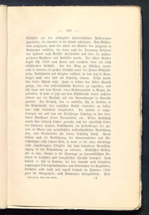 Geschäfte auf den wichtigsten Handelsplätzen Westeuropas gegründet, die einander in die Hände arbeiteten. Von Amster-dam ausgehend, hatte der ältere der Brüder den jüngeren inAntwerpen etabliert, der dann nach der Trennung Belgiens von Holland nach Brüssel übersiedelte und dort ein hochan-gesehcner Bankherr und Politiker wurde. Der ältere Bruderbegab sich 1848 nach Paris und errichtete dort ein rascherblühendes Geschäft. Um den Ring zu schließen, wurdeauch in London ein großes Geschäft unter der Firma Bischosfs-heim, Goldschmidt und Avigdor eröffnet, in das jetzt L. Bam-berger wohl oder übel als Lehrling eintrat. Leicht wurdeihm dieser Schritt nicht. Hatte er früher den stillen Wunschgehegt, eine rein wissenschaftliche Karriere zu ergreifen, undsich dann mit dein Berufe eines Rechtsanwalts in Mainz ab-gefunden, so hatte er jetzt aus dem Schiffbrnche seines äußerenLebens nur die Aussicht auf eine Anwaltpraxis in Amerika gerettet. Der Versuch, den er anstellte, sich in London indie Geheimnisse des englischen Rechts einweihen zu lassen,war nicht verlockend ausgefallen. Da sattelte er notge-drungen um und trat als 26 jähriger Lehrling in das Lon-doner Bankhans seiner Verwandten ein. Dieser Entschlußwurde ihm dadurch leichter gemacht, daß der eigentliche Leiterdes Londoner Hauses, Goldschmidt, ein Heidelberger Or. jur.und ein Mann von gründlichster wissenschaftlicher Vorbildungwar, also Verständnis für seinen Lehrling besaß. Wenndiesem auch die Ausführung der Komorarbeiten und Be-rechnungen nicht erspart blieb, so hatte er bei einer allerdingsrecht angestrengten Tätigkeit sich doch besonderer Berücksich-tigung in der Behandlung zu erfreuen. Elastischen Geistes,wie er war, konnte er die Sonntage zu journalistischen Ar-beiten in deutscher und französischer Sprache benutzen. Dochbefand er sich in London , bei den damals noch besondersengherzigen Lcbensgewohnheiten und Gebräuchen der Engländer,durchaus nicht wohl und ergriff deshalb im Sommer 1850gern die Gelegenheit, nach Antwerpen überzusiedeln. Sein