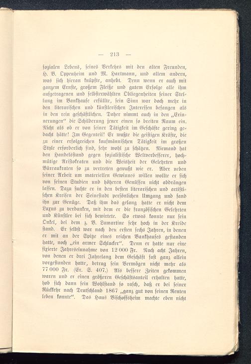 sozialen Lebens, seines Verkehrs mit den alten Freunden,H. B. Oppenheim und M. Hartmann, nnd allem andern,was sich hieran knüpfte, anhebt. Denn wenn er auch mitganzem Ernste, großem Fleiße nnd gutem Erfolge alle ihmanfgetragcucu uud selbsterwählten Obliegenheiten seiner Stel-lung im Bankhause erfüllte, sein Sinn war doch mehr inden literarischen und künstlerischen Interessen befangen alsin den rein geschäftlichen. Daher nimmt auch in den „Erin-nerungen" die Schilderung jener einen so breiten Raum ein.Nicht als ob er von seiner Tätigkeit im Geschäfte gering ge-dacht hätte! Im Gegenteil! Er wußte die geistigen Kräfte, diezu einer erfolgreichen kaufmännischen Tätigkeit im großenSthlc erforderlich sind, sehr wohl zu schätzen. Niemand hatden Handelsstand gegen sozialistische Weltverbesserer, hoch-mütige Aristokraten und die Weisheit der Gelehrten undBüreaukraten so zu vertreten gewußt wie er. Aber nebenseiner Arbeit um materiellen Gewinnes willen wollte er sichvon seinen Studien uud höheren Genüssen nicht abdrängenlassen. Dazu suchte er in den besten literarischen und artisti-schen Kreisen der Seinestadt persönlichen Umgang nnd fandihn zur Genüge. Daß ihm das gelang hatte er nicht demLuxus zu verdanken, mit dem er die französischen Gelehrtenund Künstler bei sich bewirtete. So etwas konnte nur seinOnkel, bei dem z. B. Lamartine sehr hoch in der Kreidestand. Er selbst war nach den ersten sechs Jahren, in denener mit an der Spitze eines reichen Bankhauses gestandenhatte, noch „ein armer Schlucker". Denn er hatte nur einefixierte Jahrcscinnahme von 12 000 Fr. Nach acht Jahren,von denen er drei Jahrelang dem Geschäft fast ganz alleinvorgestanden hatte, betrug sein Vermögen nicht mehr als77 000 Fr. (Er. S. 407.) Als bessere Zeiten gekommenwaren und er einen größeren Geschäftsanteil erhalten hatte,hob sich dann sein Wohlstand so rasch, daß er bei seinerRückkehr nach Deutschland 1867 „ganz gut von seinen Rentenleben konnte". Das Hans Bischoffsheim machte eben nicht