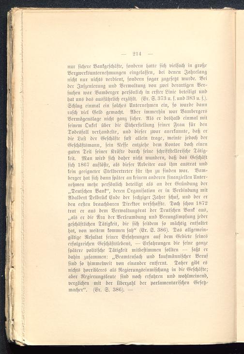 nur sichere Bankgeschäfte, sondern hatte sich vielfach in großeBergwcrksunternehmnngen eingelassen, bei denen Jahrelangnicht nur nichts verdient, sondern sogar zugesetzt wurde. Beider Inszenierung und Verwaltung von zwei derartigen Ver-suchen war Bambcrger persönlich in erster Linie beteiligt undhat uns das ausführlich erzählt. (Er. S. 373 u. f. und 383 n. f.).Schlug einmal ein solches Unternehmen ein, so wurde dannrasch viel Geld gemacht. Aber immerhin war BambergcrsVermögenslage nicht ganz sicher. Als er deshalb einmal mitseinem Onkel über die Sichcrstellung seiner Frau für denTodesfall verhandelte, und dieser zwar anerkannte, daß erdie Last der Geschäfte fast allein trage, meinte jedoch derGeschäftsmann, sein Neffe entziehe dem Kontor doch einenguten Teil seiner Kräfte durch seine schriftstellerische Tätig-keit. Man wird sich daher nicht wundern, daß das Geschäftsich 1867 auflöste, als dieser Arbeiter aus ihm austrat undkein geeigneter Stellvertreter für ihn zu finden war. Bam-bergcr hat sich dann später an keinem anderen finanziellen Unter-nehmen mehr persönlich beteiligt als an der Gründung der„Deutschen Bank", deren Organisation er in Verbindung mitAdalbert Dclbrück Ende der sechziger Jahre schuf, und der erden ersten brauchbaren Direktor verschaffte. Doch schon 1872trat er aus dem Verwaltungsrat der Deutschen Bank aus,„als er die Ära der Verleumdung und Verunglimpfung jedergeschäftlichen Tätigkeit, die sich seitdem so mächtig entfaltethat, von weitem kommen sah" (Er. S. 386). Das allgemein-giltige Resultat seiner Erfahrungen auf dem Gebiete seineserfolgreichen Geschäftslebens, — Erfahrungen die seine ganzespätere politische Tätigkeit mitbestimmen sollten — faßt erdahin zusammen: „Bcamtenfach und kaufmännischer Berufsind so himmelweit von einander entfernt. Daher gibt esnichts horribleres als Regierungseinmischnng in die Geschäfte;aber Regierungslente sind noch erfahren und wohlmeinend,verglichen mit der Überzahl der Parlamentarischen Gesetz-macher". (Er. S. 386). —