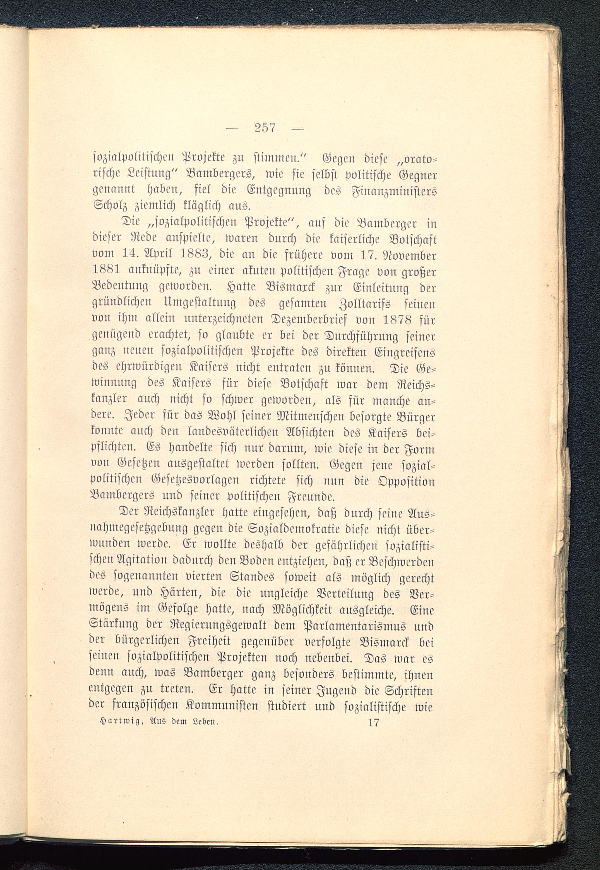 Der Reichskanzler hatte eingesehen, daß durch seine Aus-nahmegesetzgcbnng gegen die Sozialdemokratie diese nicht über-wunden werde. Er wollte deshalb der gefährlichen sozialisti-schen Agitation dadurch den Boden entziehen, daß er Beschwerdendes sogenannten vierten Standes soweit als möglich gerechtwerde, und Härten, die die ungleiche Verteilung des Ver-mögens im Gefolge hatte, nach Möglichkeit ausgleiche. EineStärkung der Regiernngsgcwalt dem Parlamentarismus undder bürgerlichen Freiheit gegenüber verfolgte Bismarck beiseinen sozialpolitischen Projekten noch nebenbei. Das war esdenn auch, was Bamberger ganz besonders bestimmte, ihnenentgegen zu treten. Er hatte in seiner Jugend die Schriftender französischen Kommunisten studiert und sozialistische wieHartwig. A»S dcm Lcbcit. 17