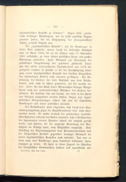 Die „sozialpolitischen Projekte", auf die Bamberger indieser Rede anspielte, waren durch die kaiserliche Botschaftvom 14. April 1883, die an die frühere pom 17. November1881 anknüpfte, zu einer akuten politischen Frage von großerBedeutung geworden. Hatte. Bismarck zur Einleitung dergründlichen Umgestaltung des gesamten Zolltarifs seine»von ihm allein unterzeichneten Dezemberbrief von 1878 fürgenügend erachtet, so glaubte er bei der Durchführung seinerganz neuen sozialpolitischen Projekte des direkten Eingreifensdes ehrwürdigen Kaisers nicht entraten zu können. Die Ge-winnung des Kaisers für diese Botschaft war dem Reichs-kanzler auch nicht so schwer geworden, als für manche an-dere. Jeder für das Wohl seiner Mitmenschen besorgte Bürgerkonnte auch den landesväterlichen Absichten des Kaisers bei-pflichten. Es handelte sich nur darum, wie diese in der Formvon Gesetzen ausgestaltet werden sollten. Gegen jene sozial-politischen Gcsetzesvorlagen richtete sich nun die OppositionBambergers und seiner politischen Freunde.