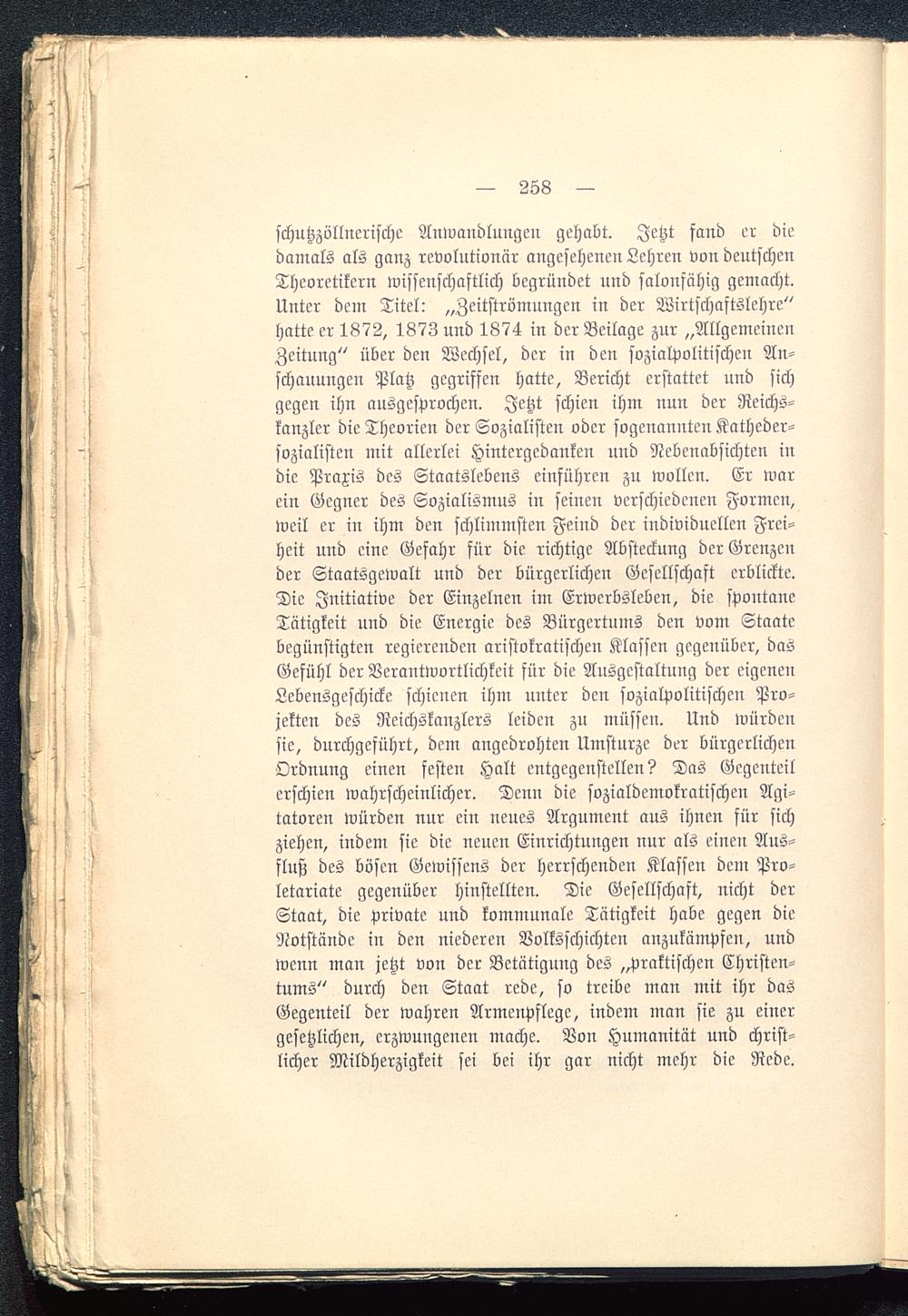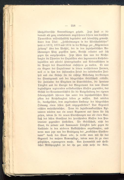 schutzzöllnerische Anwandlungen gehabt. Jetzt fand er diedamals als ganz revolutionär angesehenen Lehren von deutschenTheoretikern wissenschaftlich begründet und salonfähig gemacht.Unter dem Titel: „Zeitströmungcn in der Wirtschaftslchre"hatte er 1872, 1873 und 1874 in der Beilage zur „AllgemeinenZeitung" über den Wechsel, der in den sozialpolitischen An-schauungen Platz gegriffen hatte. Bericht erstattet und sichgegen ihn ausgesprochen. Jetzt schien ihm nun der Reichs-kanzler die Theorien der Sozialisten oder sogenannten Katheder-sozialisten mit allerlei Hintergedanken und Nebenabsichten indie Praxis des Staatslebens einführen zu wollen. Er warein Gegner des Sozialismus in seinen verschiedenen Formen,weil er in ihm den schlimmsten Feind der individuellen Frei-heit und eine Gefahr für die richtige Absteckung der Grenzender Staatsgewalt und der bürgerlichen Gesellschaft erblickte.Die Initiative der Einzelnen im Erwerbsleben, die spontaneTätigkeit und die Energie des Bürgertums den vom Staatebegünstigten regierenden aristokratischen Klassen gegenüber, dasGefühl der Verantwortlichkeit für die Ausgestaltung der eigenenLebensgeschicke schienen ihm unter den sozialpolitischen Pro-jekten des Reichskanzlers leiden zu müssen. Und würdensie, durchgeführt, dem angedrohten Umstürze der bürgerlichenOrdnung einen festen Halt entgegenstellen? Das Gegenteilerschien wahrscheinlicher. Denn die sozialdemokratischen Agi-tatoren würden nur ein neues Argument aus ihnen für sichziehen, indem sie die neuen Einrichtungen nur als einen Aus-fluß des bösen Gewissens der herrschenden Klassen dem Pro-letariate gegenüber hinstellten. Die Gesellschaft, nicht derStaat, die private und kommunale Tätigkeit habe gegen dieNotstände in den niederen Volksschichten anzukämpfen, undwenn man jetzt von der Betätigung des „praktischen Christen-tums" durch den Staat rede, so treibe man mit ihr dasGegenteil der wahren Armenpflege, indem man sie zu einergesetzlichen, erzwungenen mache. Von Humanität und christ-licher Mildherzigkeit sei bei ihr gar nicht mehr die Rede.