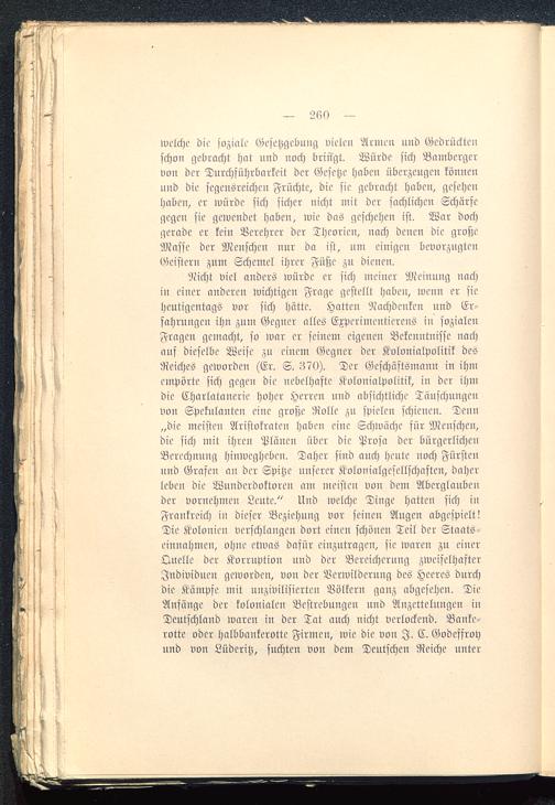 Nicht viel anders würde er sich meiner Meinung nachin einer anderen wichtigen Frage gestellt haben, wenn er sieheutigentags vor sich hätte. Hatten Nachdenken nnd Er-fahrungen ihn znm Gegner alles Experimcntierens in sozialenFragen gemacht, so war er seinem eigenen Bekenntnisse nachauf dieselbe Weise zu einem Gegner der Kvlonialpolitik desReiches geworden (Er. S. U70). Der Geschäftsmann in ihmempörte sich gegen die nebelhafte Kvlonialpolitik, in der ihmdie Charlatanerie hoher Herren und absichtliche Täuschungenvon Spekulanten eine große Rolle zu spielen schienen. Den»„die meisten Aristokraten haben eine Schwäche für Menschen,die sich mit ihren Plänen über die Prosa der bürgerlichenBerechnung Hinwegheben. Daher sind auch heute noch Fürstennnd Grafen an der Spitze unserer Kolonialgesellschaften, daherleben die Wunderdoktoren am meisten von dem Aberglaubender vornehmen Leute." Und welche Dinge hatten sich inFrankreich in dieser Beziehung vor seinen Augen abgespielt!Die Kolonien verschlangen dort einen schönen Teil der Staats-einnahmen, ohne etwas dafür einzutragen, sie waren zu einerQuelle der Korruption und der Bereicherung zweifelhafterIndividuen geworden, von der Verwilderung des Heeres durchdie Kämpfe mit »»zivilisierten Völkern ganz abgesehen. DieAnfänge der kolonialen Bestrebungen nnd Anzettelungen inDeutschland waren in der Tat auch nicht verlockend. Banke-rotte oder halbbankerotte Firmen, wie die von I. C. Godeffroynnd von Lüderitz, suchten von dem Deutschen Reiche unter