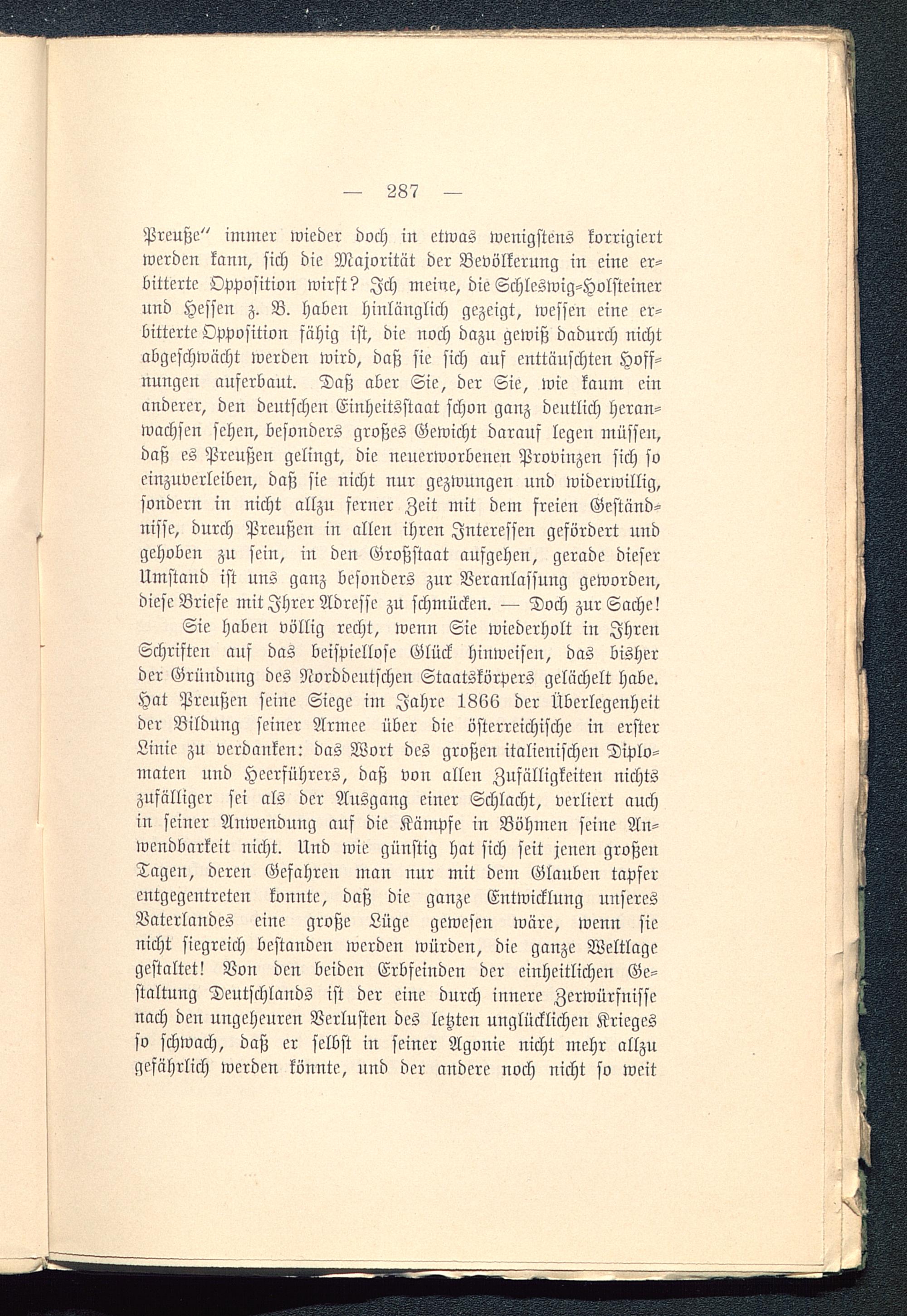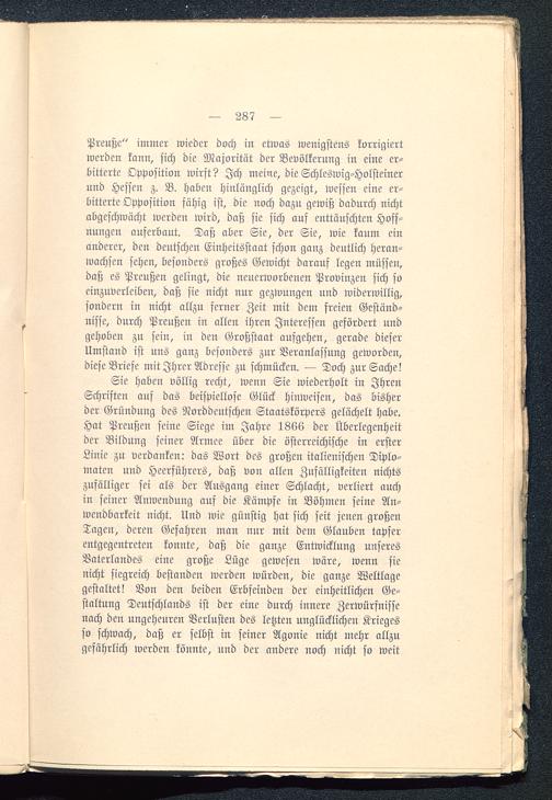 Preuße" immer wieder doch in etwas wenigstens korrigiertwerden kann, sich die Majorität der Bevölkerung in eine er-bitterte Opposition wirft? Ich meine, die Schleswig-Holsteinerund Hessen z. B. haben hinlänglich gezeigt, wessen eine er-bitterte Opposition fähig ist, die noch dazu gewiß dadurch nichtabgeschwächt werden wird, daß sie sich auf enttäuschten Hoff-nungen auferbaut. Daß aber Sie, der Sie, wie kaum einanderer, den deutschen Einheitsstaat schon ganz deutlich heran-wachsen sehen, besonders großes Gewicht darauf legen müssen,daß es Preußen gelingt, die neuerworbenen Provinzen sich soeinzuverleiben, daß sie nicht nur gezwungen und widerwillig,sondern in nicht allzu ferner Zeit mit dem freien Geständ-nisse, durch Preußen in allen ihren Interessen gefördert undgehoben zu sein, in den Großstaat aufgehen, gerade dieserUmstand ist uns ganz besonders zur Veranlassung geworden,diese Briefe mit Ihrer Adresse zu schmucken. — Doch zur Sache!