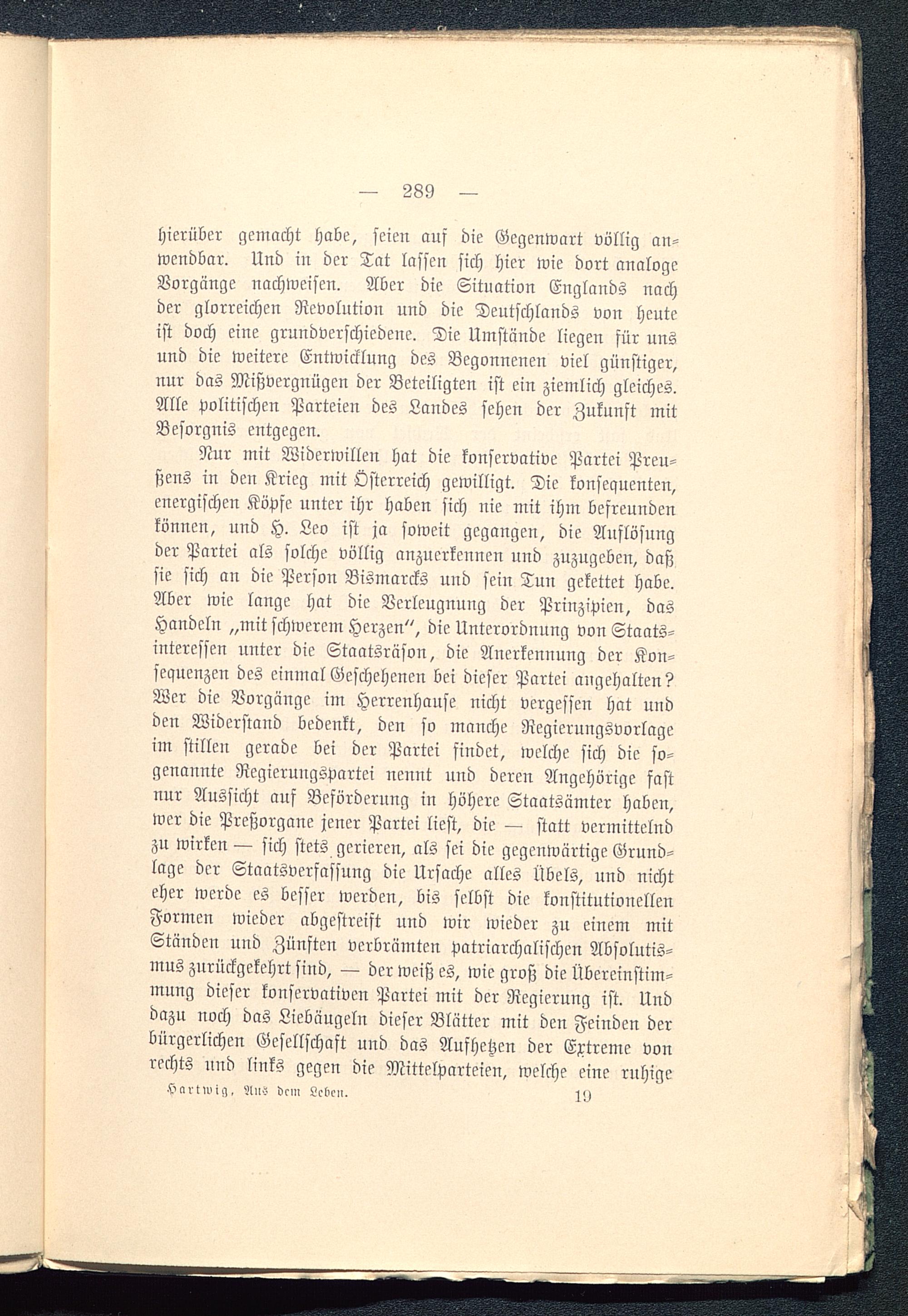 Nur mit Widerwillen hat die konservative Partei Preu-ßens in den Krieg mit Österreich gewilligt. Die konsequenten,energischen Köpfe unter ihr haben sich nie mit ihm befreundenkönnen, und H. Leo ist ja soweit gegangen, die Auflösungder Partei als solche völlig anzuerkennen und zuzugeben, daßsie sich an die Person Bismarcks und sein Tun gekettet habe.Aber wie lange hat die Verleugnung der Prinzipien, dasHandeln „mit schwerem Herzen", die Unterordnung von Staats-interessen unter die Staatsräson, die Anerkennung der Kon-sequenzen des einmal Geschehenen bei dieser Partei angehalten?Wer die Vorgänge im Herrenhanse nicht vergessen hat undden Widerstand bedenkt, den so manche Regierungsvorlageim stillen gerade bei der Partei findet, welche sich die so-genannte Regierungspartei nennt und deren Angehörige fastnur Aussicht auf Beförderung in höhere Staatsämter haben,wer die Preßorgane jener Partei liest, die — statt vermittelndzu wirken — sich stets gcrieren, als sei die gegenwärtige Grund-lage der Staatsverfassung die Ursache alles Übels, und nichteher werde es besser werden, bis selbst die konstitutionellenFormen wieder abgestreift und wir wieder zu einem mitStänden und Zünften verbrämten Patriarchalischen Absolutis-mus zurückgekehrt sind, — der weiß es, wie groß die Übereinstim-mung dieser konservativen Partei mit der Regierung ist. Unddazu noch das Liebäugeln dieser Blätter mit den Feinden derbürgerlichen Gesellschaft und das Aufhetzen der Extreme vonrechts und links gegen die Mittelparteien, welche eine ruhige