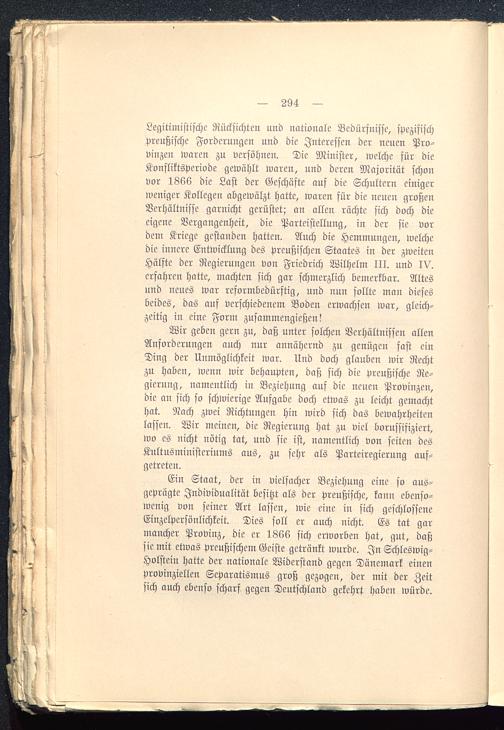 Ein Staat, der in vielfacher Beziehung eine so aus-geprägte Individualität besitzt als der preußische, kaun ebenso-wenig von seiner Art lassen, wie eine in sich geschlosseneEinzelpersönlichkeit. Dies soll er auch nicht. Es tat garmancher Provinz, die er 1866 sich erworben hat, gut, daßsie mit etwas preußischem Geiste getränkt wurde. In Schleswig-Holstein hatte der nationale Widerstand gegen Dänemark einenProvinziellen Separatismus groß gezogen, der mit der Zeitsich auch ebenso scharf gegen Deutschland gekehrt haben würde.
