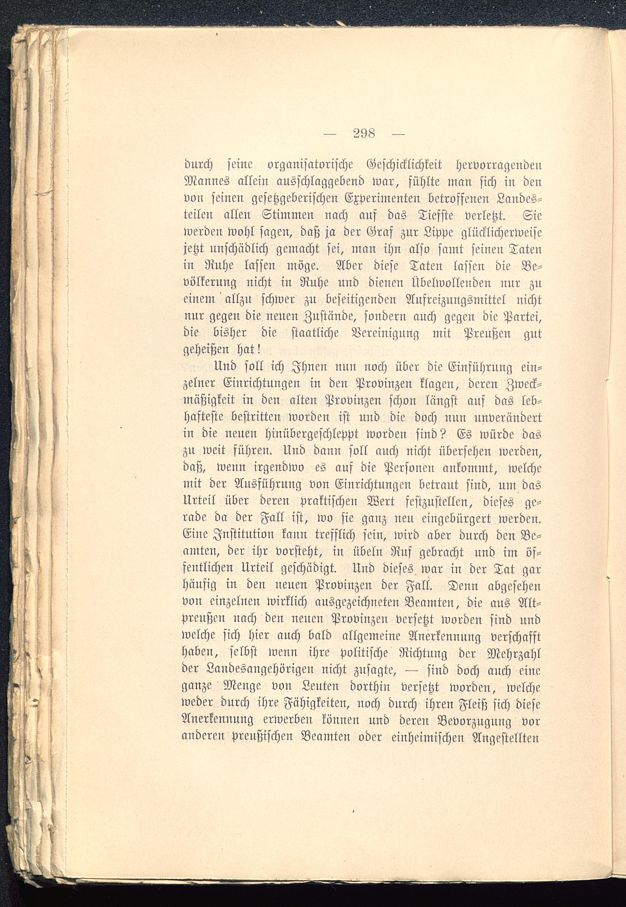 Und soll ich Ihnen nun noch über die Einführung ein-zelner Einrichtungen in den Provinzen klagen, deren Zweck-mäßigkeit in den alten Provinzen schon längst auf das leb-hafteste bestricken worden ist und die doch nun unverändertin die neuen hinübergcschleppt worden sind? Es würde daszu weit führen. Und dann soll auch nicht übersehen werden,daß, wenn irgendwo es auf die Personen ankommt, welchemit der Ausführung von Einrichtungen betraut siud, um dasUrteil über deren praktischen Wert festzustellen, dieses ge-rade da der Fall ist, wo sie ganz neu eingebürgert werden.Eine Institution kann trefflich sein, wird aber durch den Be-amten, der ihr vorsteht, in Übeln Ruf gebracht und im öf-fentlichen Urteil geschädigt. Und dieses war in der Tat garhäufig in den neuen Provinzen der Fall. Denn abgesehenvon einzelnen wirklich ausgezeichneten Beamten, die aus Alt-preußen nach den neuen Provinzen versetzt worden sind undwelche sich hier auch bald allgemeine Anerkennung verschaffthaben, selbst wenn ihre Politische Richtung der Mehrzahlder Landesangehörigen nicht zusagte, — sind doch auch eineganze Menge von Leuten dorthin versetzt worden, welcheweder durch ihre Fähigkeiten, noch durch ihren Fleiß sich dieseAnerkennung erwerben können und deren Bevorzugung voranderen preußischen Beamten oder einheimischen Angestellten