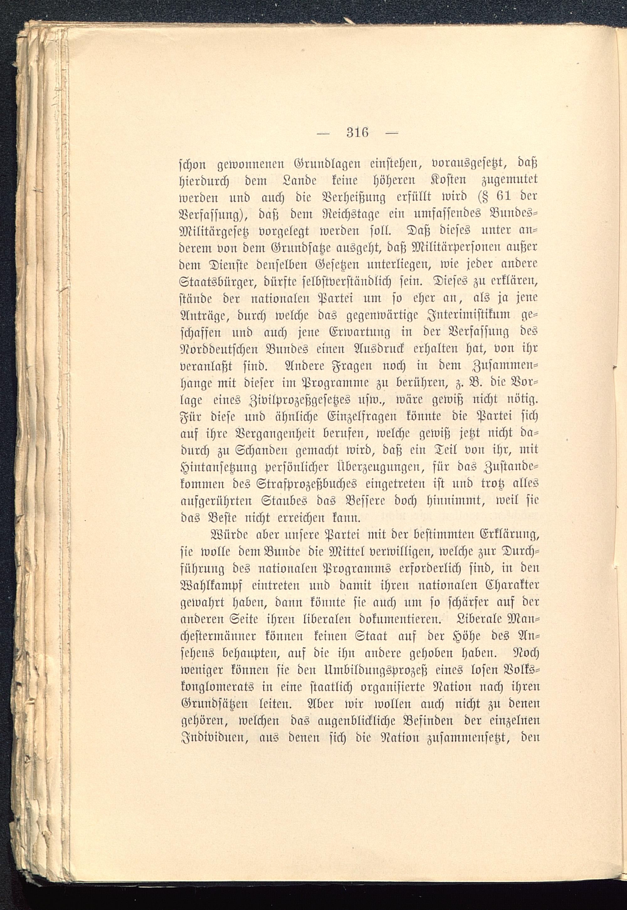 schon gewonnenen Grundlagen einstehen, vorausgesetzt, daßhierdurch dem Lande keine höheren Kosten zugemutetwerden und auch die Verheißung erfüllt wird (Z 61 derVerfassung), daß dem Reichstage ein umfassendes Bundes-Militärgesetz vorgelegt werden soll. Daß dieses unter an-derem von dem Grundsätze ausgeht, daß Militär-personen außerdem Dienste denselben Gesetzen unterliegen, wie jeder andereStaatsbürger, dürfte selbstverständlich sein. Dieses zu erklären,stände der nationalen Partei um so eher an, als ja jeneAnträge, durch welche das gegenwärtige Jnterimistikum ge-schaffen und auch jene Erwartung in der Verfassung desNorddeutschen Bundes einen Ausdruck erhalten hat, von ihrveranlaßt sind. Andere Fragen noch in dem Zusammen-hange mit dieser im Programme zu berühren, z. B. die Vor-lage eines Zivilprozcßgesetzes usw., wäre gewiß nicht nötig.Für diese und ähnliche Einzelfragen könnte die Partei sichauf ihre Vergangenheit berufen, welche gewiß jetzt nicht da-durch zu Schanden gemacht wird, daß ein Teil von ihr, mitHintansetzung persönlicher Überzeugungen, für das Zustande-kommen des Strafprozeßbuches eingetreten ist und trotz allesaufgerührten Staubes das Bessere doch hinnimmt, weil siedas Beste nicht erreichen kann.