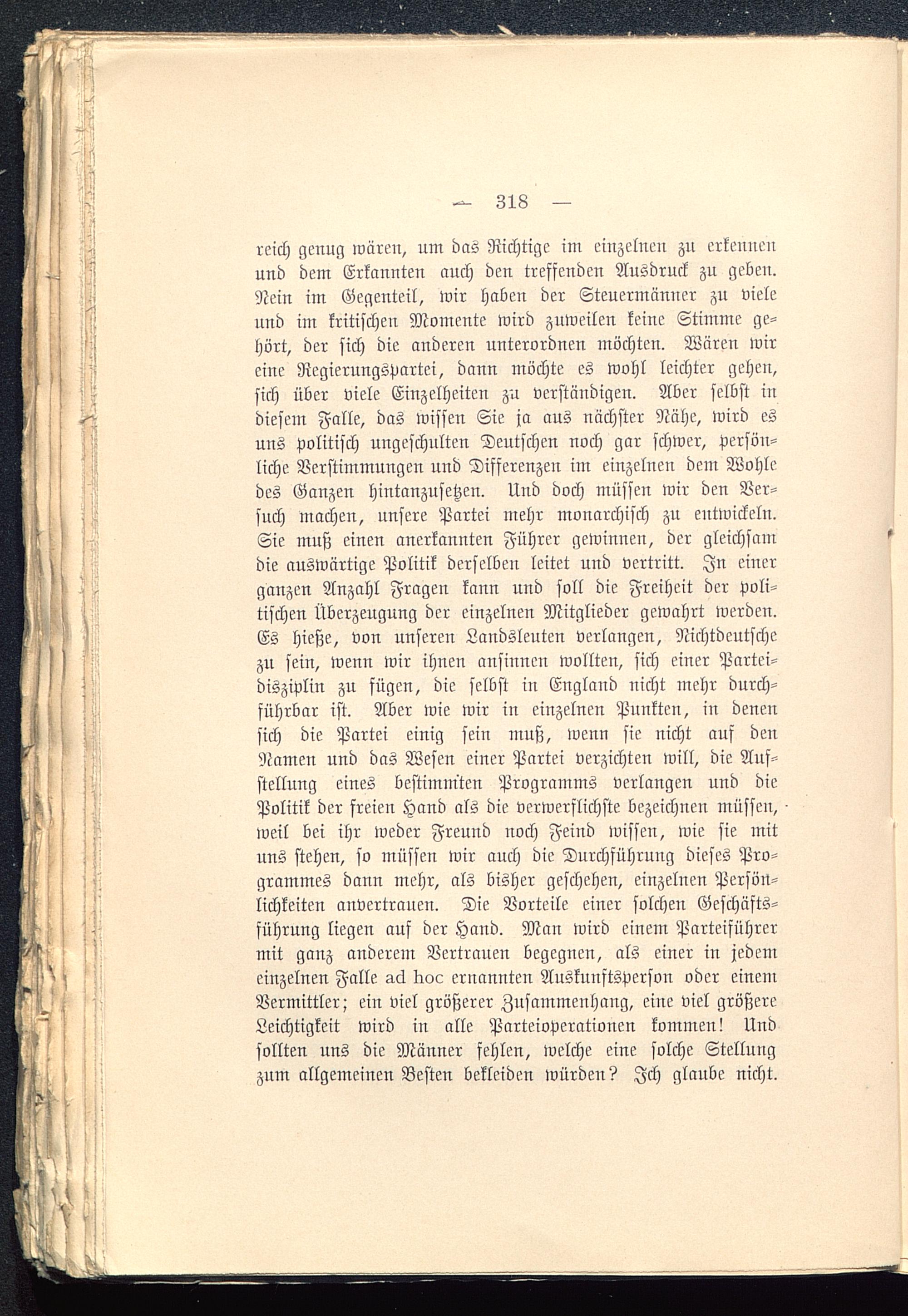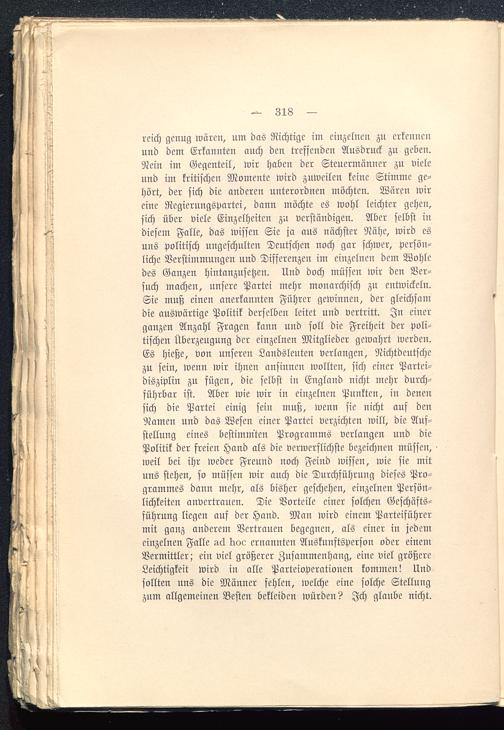 reich genug wären, um das Richtige im einzelnen zu erkennenund dem Erkannten anch den treffenden Ausdruck zu geben.Nein im Gegenteil, wir haben der Steuermänner zu vieleund im kritischen Momente wird zuweilen keine Stimme ge-hört, der sich die anderen unterordnen möchten. Wären wireine Regierungspartei, dann möchte es Wohl leichter gehen,sich über viele Einzelheiten zu verständigen. Aber selbst indiesem Falle, das wissen Sie ja aus nächster Nähe, wird esuns politisch ungeschickten Deutschen noch gar schwer, persön-liche Verstimmungen und Differenzen im einzelnen dem Wohledes Ganzen hintanzusetzen. Und doch müssen wir den Ver-such machen, unsere Partei mehr monarchisch zu entwickeln.Sie muß einen anerkannten Führer gewinnen, der gleichsamdie auswärtige Politik derselben leitet und vertritt. In einerganzen Anzahl Fragen kann und soll die Freiheit der poli-tischen Überzeugung der einzelnen Mitglieder gewahrt werden.Es hieße, von unseren Landsleuten verlangen, Nichtdeutschezu sein, wenn wir ihnen ansinnen wollten, sich einer Partei-disziplin zu fügen, die selbst in England nicht mehr durch-führbar ist. Aber wie wir in einzelnen Punkten, in denensich die Partei einig sein muß, wenn sie nicht auf denNamen und das Wesen einer Partei verzichten will, die Auf-stellung eines bestimmten Programms verlangen und diePolitik der freien Hand als die verwerflichste bezeichnen müssen,weil bei ihr weder Freund noch Feind wissen, wie sie mituns stehen, so müssen wir auch die Durchführung dieses Pro-grammes dann mehr, als bisher geschehen, einzelnen Persön-lichkeiten anvertrauen. Die Vorteile einer solchen Geschäfts-führung liegen auf der Hand. Man wird einem Parteiführermit ganz anderem Vertrauen begegnen, als einer in jedemeinzelnen Falle ack Iioc ernannten Auskunftsperson oder einemVermittler; ein viel größerer Zusammenhang, eine viel größereLeichtigkeit wird in alle Parteioperationen kommen! Undsollten uns die Männer fehlen, welche eine solche Stellungznm allgemeinen Besten bekleiden würden? Ich glaube nicht.