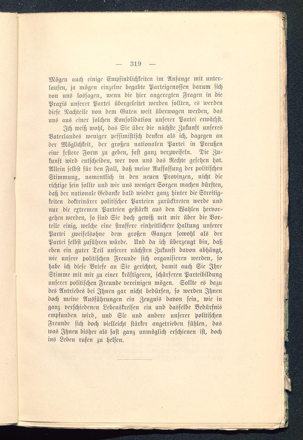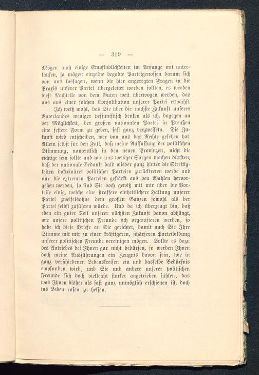 Ich weiß wohl, das Sie über die nächste Zukunft unseresVaterlandes weniger pessimistisch denken als ich, dagegen ander Möglichkeit, der großen nationalen Partei in Preußen eine festere Form zu geben, fast ganz verzweifeln. Die Zu-kunft wird entscheiden, wer von uns das Rechte gesehen hat.Allein selbst für den Fall, daß meine Auffassung der politischenStimmung, namentlich in den neuen Provinzen, nicht dierichtige sein sollte und wir uns weniger Sorgen machen dürften,daß der nationale Gedanke bald wieder ganz hinter die Streitig-keiten doktrinärer politischer Parteien zurücktreten werde undnur die extremen Parteien gestärkt aus den Wahlen hervor-gehen werden, so sind Sie doch gewiß mit mir über die Vor-teile einig, welche eine straffere einheitlichere Haltung unsererPartei zweifelsohne dem großen Ganzen sowohl als derPartei selbst zuführen würde. Und da ich überzeugt bin, daßeben ein guter Teil unserer nächsten Zukunft davon abhängt,wie unsere politischen Freunde sich organisieren werden, sohabe ich diese Briefe an Sie gerichtet, damit auch Sie IhreStimme mit mir zu einer kräftigeren, schärferen Parteibildungunserer politischen Freunde vereinigen mögen. Sollte es dazudes Antriebes bei Ihnen gar nicht bedürfen, so werden Ihnendoch meine Ausführungen ein Zeugnis davon sein, wie inganz verschiedenen Lcbenskreisen ein und dasselbe Bedürfnisempfunden wird, und Sie und andere unserer politischenFreunde sich doch vielleicht stärker angetrieben fühlen, daswas Ihnen bisher als fast ganz unmöglich erschienen ist, dochins Leben rufen zu helfen.