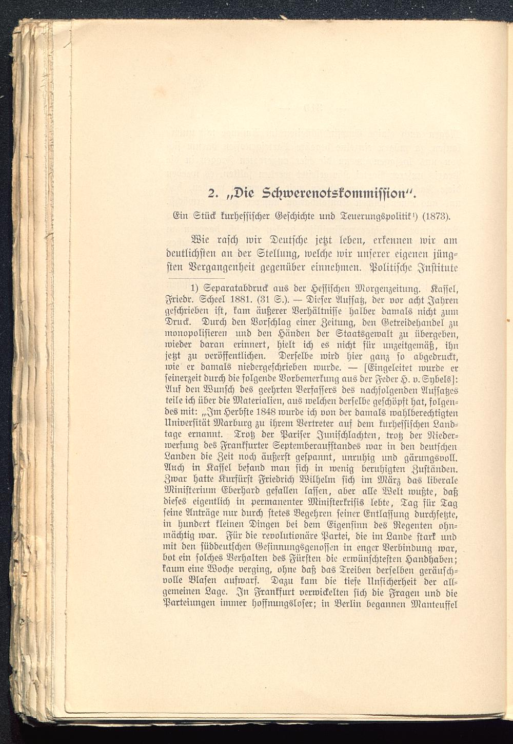 1) Separatabdruck aus der Hessischen Morgenzeitung. Kassel ,Friedr. Scheel 1881. (31 S.j. — Dieser Aussatz, der vor acht Jahrengeschrieben ist, kam äußerer Verhältnisse halber damals nicht zumDruck. Durch den Vorschlag einer Zeitung, den Getreidehandel zumonopolisieren und den Händen der Staatsgewalt zu übergeben,wieder daran erinnert, hielt ich es nicht für unzeitgemäß, ihnjetzt zu veröffentlichen. Derselbe wird hier ganz so abgedruckt,wie er damals niedergeschrieben wurde. — (Eingeleitet wurde erseinerzeit durch die folgende Vorbemerkung aus der Feder H. v. Sybelss:Auf den Wunsch des geehrten Verfassers des nachfolgenden Aufsatzesteile ich über die Materialien, aus welchen derselbe geschöpft hat, folgen-des mit: „Im Herbste 1848 wurde ich von der damals wahlberechtigtenUniversität Marburg zu ihrem Vertreter auf den: kurhessischen Land-tage ernannt. Trotz der Pariser Junischlachten, trotz der Nieder-werfung des Frankfurter Septemberaufstandes war in den deutschenLanden die Zeit noch äußerst gespannt, unruhig und gärungsvoll.Auch in Kassel befand man sich in wenig beruhigten Zuständen.Zwar hatte Kurfürst Friedrich Wilhelm sich im März das liberaleMinisterium Eberhard gefallen lassen, aber alle Welt wußte, daßdieses eigentlich in permanenter Ministerkrisis lebte, Tag für Tagseine Anträge nur durch stetes Begehren seiner Entlassung durchsetzte,in hundert kleinen Dingen bei dem Eigensinn des Regenten ohn-mächtig war. Für die revolutionäre Partei, die im Lande stark undmit den süddeutschen Gesinnungsgenossen in enger Verbindung war,bot ein solches Verhalten des Fürsten die erwünschtesten Handhaben;kaum eine Woche verging, ohne daß das Treiben derselben geräusch-volle Blasen auswarf. Dazu kam die tiefe Unsicherheit der all-gemeinen Lage. In Frankfurt verwickelten sich die Fragen und diePartciungen immer hoffnungsloser; in Berlin begannen Mantenffel