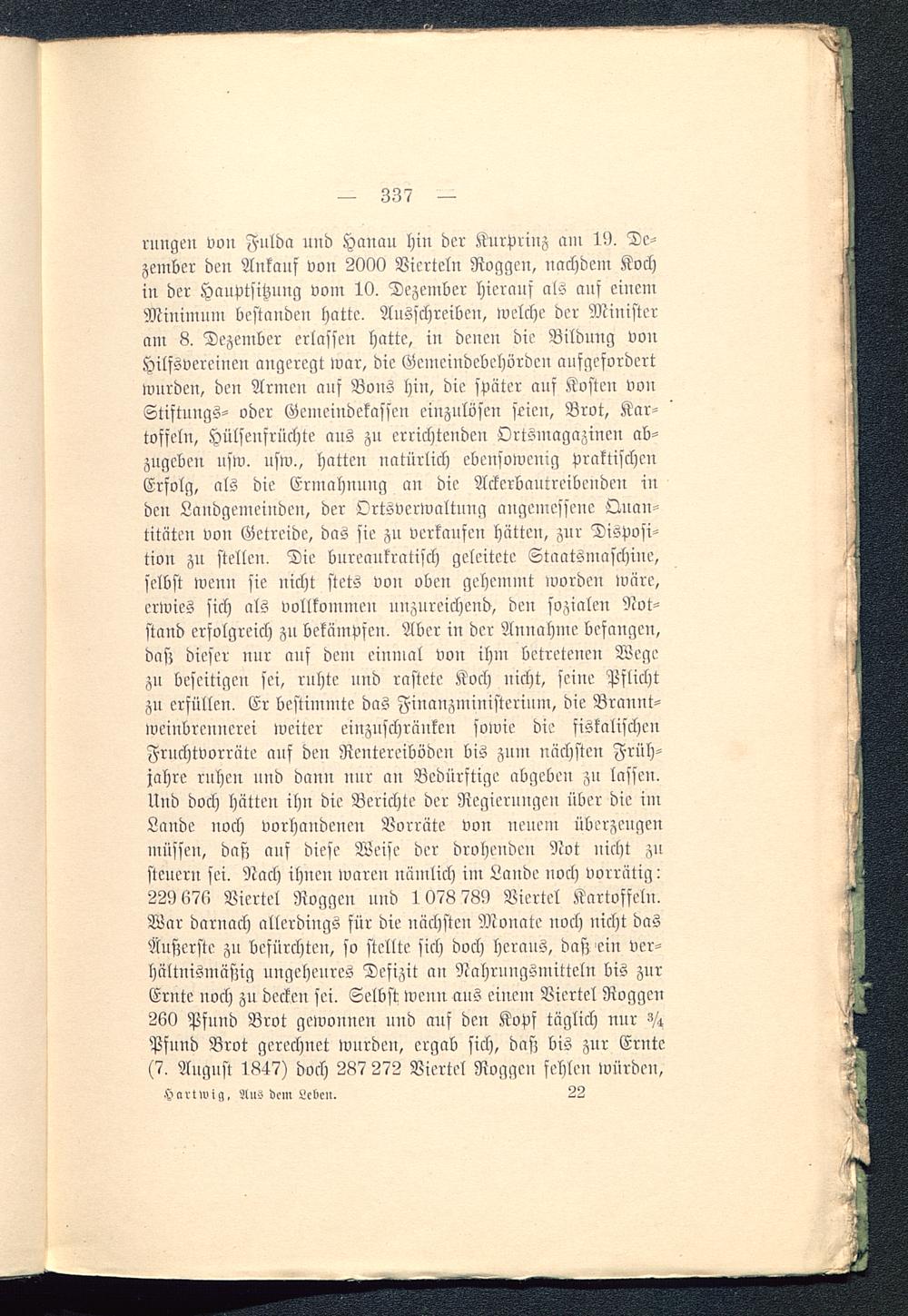 rungen von Fulda und Hanau hin der Kurprinz am 13. De-zember den Ankauf von 2000 Vierteln Roggen, nachdem Kochin der Hauptsitznng vom 10. Dezember hierauf als auf einemMinimum bestanden hatte. Ausschreiben, welche der Ministeram 8. Dezember erlassen hatte, in denen die Bildung vonHilfsvereinen angeregt war, die Gemeindebehörden aufgefordertwurden, den Armen auf Bons hin, die später auf Kosten vonStiftnngs- oder Gemeindekasscn einzulösen seien, Brot, Kar-toffeln, Hülsenfrüchte aus zu errichtenden Ortsmagazinen ab-zugeben usw. usw., hatten natürlich ebensowenig praktischenErfolg, als die Ermahnung an die Ackerbautreibenden inden Landgemeinden, der Ortsverwaltnng angemessene Quan-titäten von Getreide, das sie zu verkaufen hätten, zur Disposi-tion zu stellen. Die bureankratisch geleitete Staatsmaschine,selbst wenn sie nicht stets von oben gehemmt worden wäre,erwies sich als vollkommen unzureichend, den sozialen Not-stand erfolgreich zu bekämpfen. Aber in der Annahme befangen,das; dieser nur auf dem einmal von ihm betretenen Wegezu beseitigen sei, ruhte und rastete Koch nicht, seine Pflichtzu erfüllen. Er bestimmte das Finanzministerium, die Brannt-weinbrennerei weiter einzuschränken sowie die fiskalischenFrnchtvorrüte auf den Rentereiböden bis zum nächsten Früh-jahre ruhen und dann nur an Bedürftige abgeben zu lassen.Und doch hätten ihn die Berichte der Regierungen über die imLande noch vorhandenen Borräte von neuem überzeugenmüssen, daß auf diese Weise der drohenden Not nicht zusteuern sei. Nach ihnen waren nämlich im Lande noch vorrätig:229 676 Viertel Roggen und 1078 789 Viertel Kartoffeln.War darnach allerdings für die nächsten Monate noch nicht dasÄußerste zu befürchten, so stellte sich doch heraus, das; ein ver-hältnismäßig ungeheures Defizit an Nahrungsmitteln bis znrErnte noch zu decken sei. Selbst wenn aus einem Viertel Roggen260 Pfund Brot gewonnen und auf den Kopf täglich nur V-cPfund Brot gerechnet wurden, ergab sich, das; bis zur Ernte(7. August 1847) doch 287 272 Viertel Roggen fehlen würden,