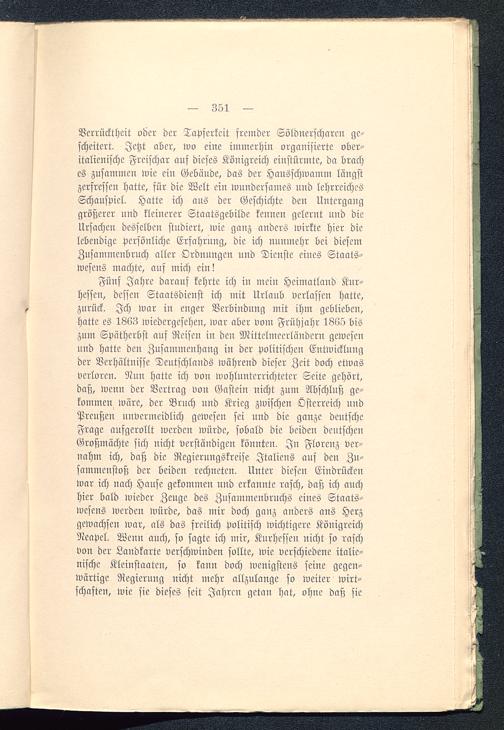 Fünf Jahre darauf kehrte ich in mein Heimatland Kur-hessen, dessen Staatsdienst ich mit Urlaub verlassen hatte,zurück. Ich war in enger Verbindung mit ihm geblieben,hatte es 1863 wiedergesehen, war aber vom Frühjahr 1865 biszum Spätherbst auf Reisen in den Mittelmeerländern gewesenund hatte den Zusammenhang in der politischen Entwicklungder Verhältnisse Deutschlands während dieser Zeit doch etwasverloren. Nun hatte ich von wohlunterrichteter Seite gehört,daß, wenn der Vertrag von Gastein nicht zum Abschluß ge-kommen wäre, der Bruch und Krieg zwischen Österreich undPreußen unvermeidlich gewesen sei und die ganze deutscheFrage aufgerollt werden würde, sobald die beiden deutschenGroßmächte sich nicht verständigen könnten. In Florenz ver-nahm ich, daß die Regierungskreise Italiens auf den Zu-sammenstoß der beiden rechneten. Unter diesen Eindrückenwar ich nach Hause gekommen und erkannte rasch, daß ich auchhier bald wieder Zeuge des Zusammenbruchs eines Staats-wesens werden würde, das mir doch ganz anders aus Herzgewachsen war, als das freilich politisch wichtigere KönigreichNeapel . Wenn auch, so sagte ich mir, Kurhessen nicht so raschvon der Landkarte verschwinden sollte, wie verschiedene italie-nische Kleinstaaten, so kann doch wenigstens seine gegen-wärtige Regierung nicht mehr allzulange so weiter wirt-schaften, wie sie dieses seit Jahren getan hat, ohne daß sie