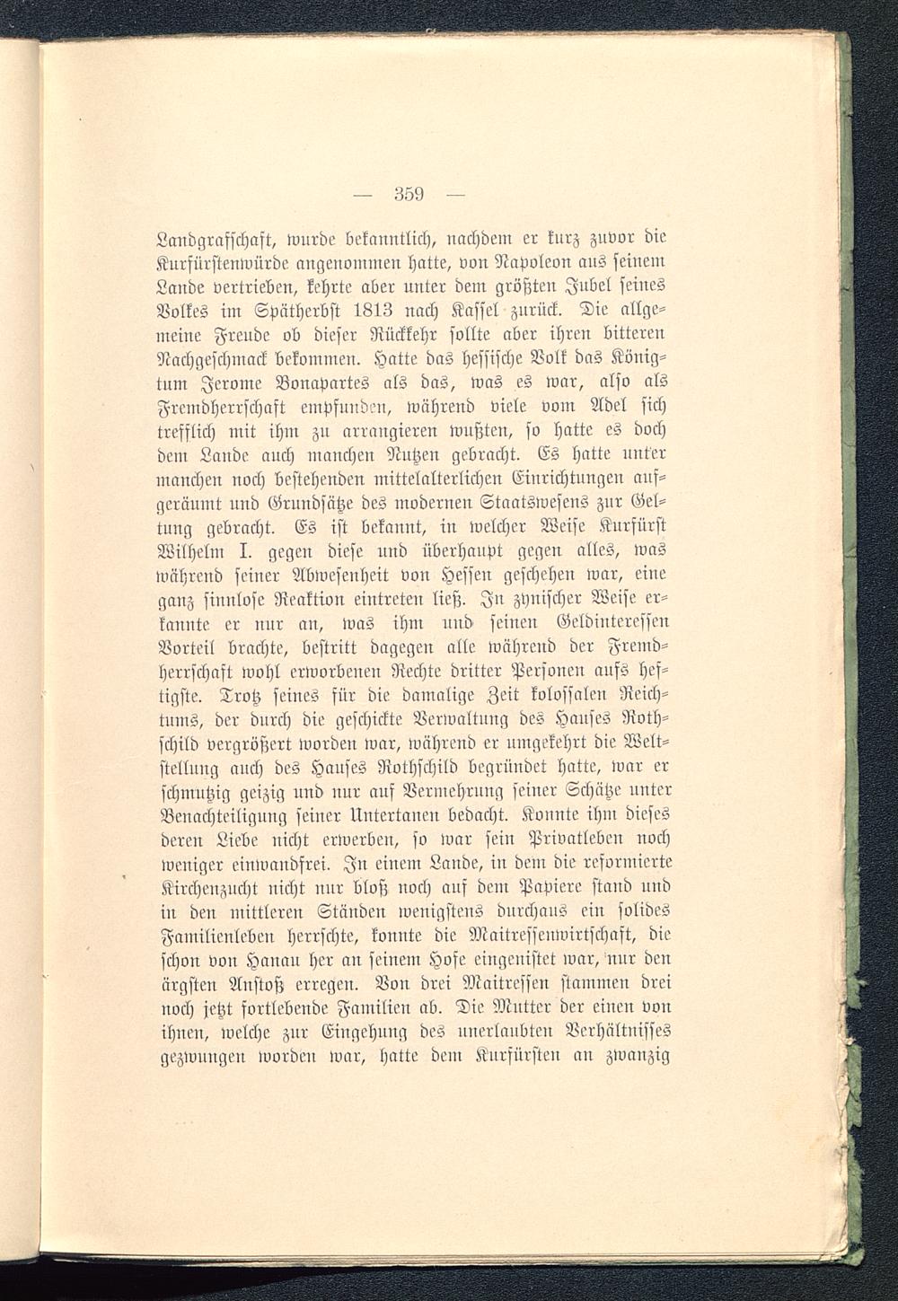 Landgrafschaft, wurde bekanntlich, nachdem er kurz zuvor dieKurfürstenwürde angenommen hatte, von Napoleon aus seinemLande vertrieben, kehrte aber unter dem größten Jubel seinesVolkes im Spätherbst 1813 nach Kassel zurück. Die allge-meine Freude ob dieser Rückkehr sollte aber ihren bitterenNachgeschmack bekommen. Hatte das hessische Volk das König-tum Jerome Bonapartes als das, was es war, also alsFremdherrschaft empfunden, während viele vom Adel sichtrefflich mit ihm zu arrangieren wußten, so hatte es dochdem Lande auch manchen Nutzen gebracht. Es hatte untermanchen noch bestehenden mittelalterlichen Einrichtungen auf-geräumt und Grundsätze des modernen Staatswesens zur Gel-tung gebracht. Es ist bekannt, in welcher Weise KurfürstWilhelm I. gegen diese und überhaupt gegen alles, waswährend seiner Abwesenheit von Hessen geschehen war, eineganz sinnlose Reaktion eintreten ließ. In zynischer Weise er-kannte er nur au, was ihm nud seinen GeldinteressenVorteil brachte, bestrick dagegen alle während der Fremd-herrschaft wohl erworbenen Rechte dritter Personen aufs hef-tigste. Trotz seines für die damalige Zeit kolossalen Reich-tums, der durch die geschickte Verwaltung des Hauses Roth-schild vergrößert worden war, während er umgekehrt die Welt-stellung auch des Hauses Rothschild begründet hatte, war erschmutzig geizig und nur auf Vermehrung seiner Schütze unterBenachteiligung seiner Untertanen bedacht. Konnte ihm diesesderen Liebe nicht erwerben, so war sein Privatleben nochweniger einwandfrei. In einem Lande, in dem die reformierteKirchenzucht nicht nur bloß noch auf dem Papiere stand undin den mittleren Ständen wenigstens durchaus ein solidesFamilienleben herrschte, konnte die Maitressenwirtschaft, dieschon von Hanau her an seinem .Hofe eingenistet war, nur denärgsten Anstoß erregen. Von drei Maitressen stammen dreinoch jetzt fortlebende Familien ab. Die Mutter der einen vonihnen, welche zur Eingehung des unerlaubten Verhältnissesgezwungen worden war, hatte dem Kurfürsten an zwanzig