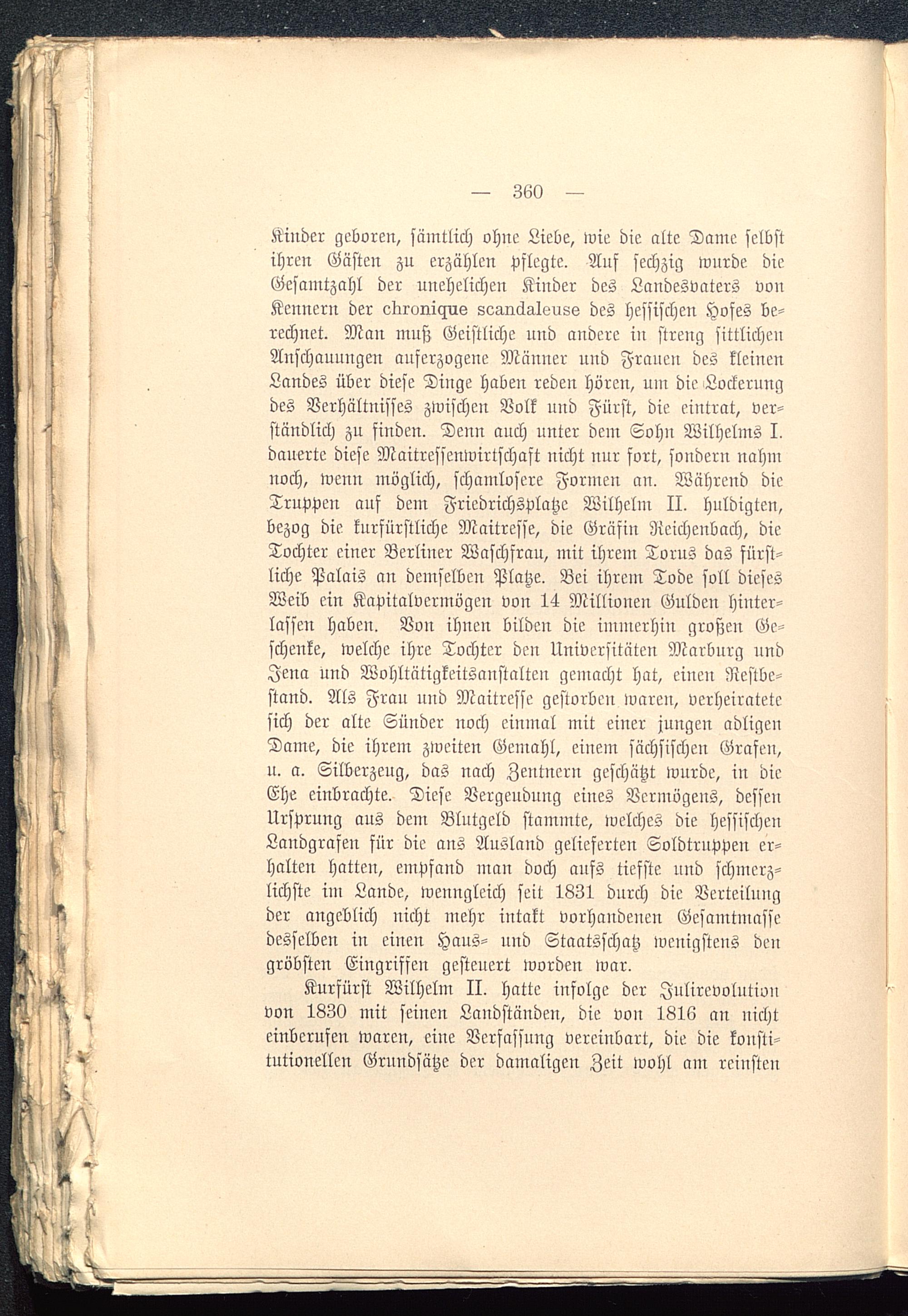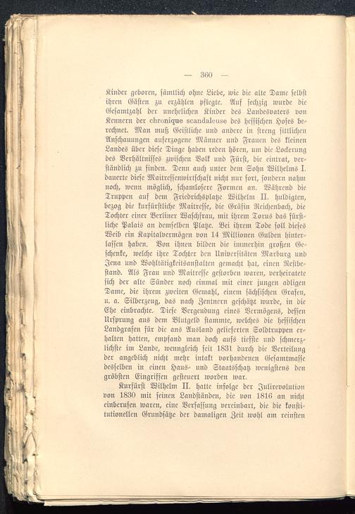 Kinder geboren, sämtlich ohne Liebe, wie die alte Dame selbstihren Gästen zu erzählen Pflegte. Auf sechzig wurde dieGesamtzahl der unehelichen Kinder des Landesvaters vonKennern der okroirigriö scunckulsuss des hessischen Hofes be-rechnet. Man muß Geistliche und andere in streng sittlichenAnschauungen auferzogene Männer und Frauen des kleinenLandes über diese Dinge haben reden hören, um die Lockerungdes Verhältnisses zwischen Volk und Fürst, die eintrat, ver-ständlich zu finden. Denn auch unter dem Sohn Wilhelms I.dauerte diese Maitressenwirtschaft nicht nur fort, sondern nahmnoch, wenn möglich, schamlosere Formen an. Während dieTruppen auf dem Friedrichsplatze Wilhelm II. huldigten,bezog die kurfürstliche Maitresse, die Gräfin Reichenbach, dieTochter einer Berliner Waschfrau, mit ihrem Torus das fürst-liche Palais an demselben Platze. Bei ihrem Tode soll diesesWeib ein Kapitalvermögen von 14 Millionen Gulden hinter-lassen haben. Von ihnen bilden die immerhin großen Ge-schenke, welche ihre Tochter den Universitäten Marburg undJena und Wohltätigkeitsanstalten gemacht hat, einen Nestbe-stand. Als Frau und Maitresse gestorben waren, verheiratetesich der alte Sünder noch einmal mit einer jungen adligenDame, die ihrem zweiten Gemahl, einem sächsischen Grafen,u. a. Silberzeug, das nach Zentnern geschätzt wurde, iu dieEhe einbrachte. Diese Vergeudung eines Vermögens, dessenUrsprung aus dem Blutgeld stammte, welches die hessischenLandgrafen für die ans Ausland gelieferten Soldtruppen er-halten hatten, empfand man doch aufs tiefste und schmerz-lichste im Lande, wenngleich seit 1831 durch die Verteilungder angeblich nicht mehr intakt vorhandenen Gesamtmassedesselben in einen Haus- und Staatsschatz wenigstens dengröbsten Eingriffen gesteuert worden war.