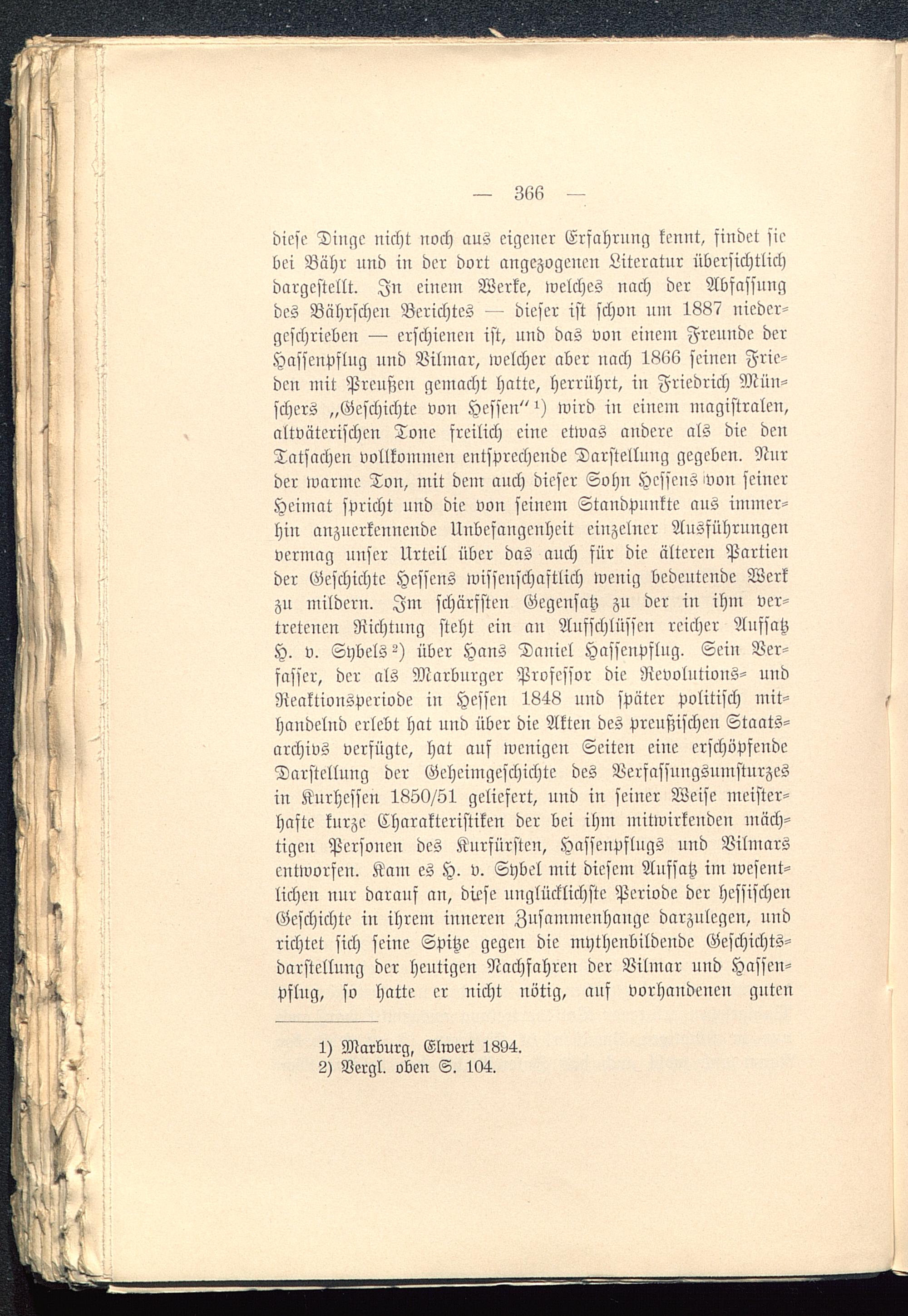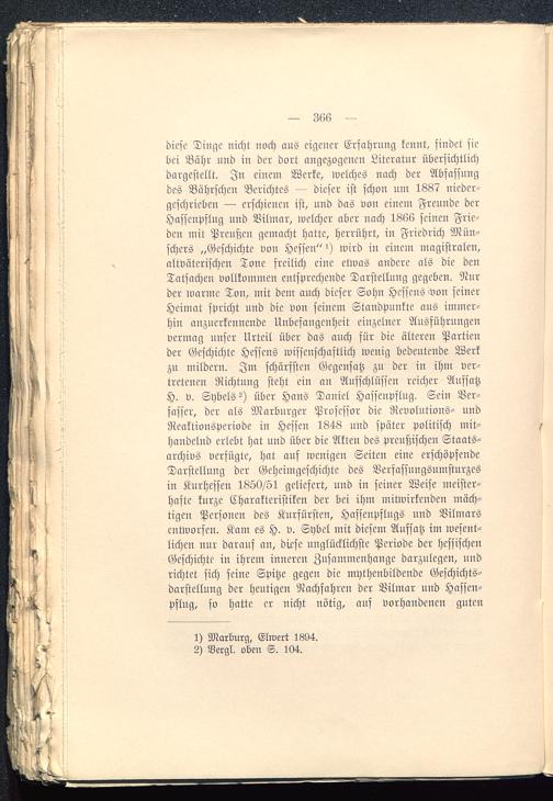 diese Dinge nicht noch aus eigener Erfahrung kennt, findet siebei Bahr und in der dort angezogenen Literatur übersichtlichdargestellt. In einem Werke, welches nach der Abfassungdes Bährschen Berichtes — dieser ist schon um 1887 nieder-geschrieben — erschienen ist, und das von einem Freunde derHassenpflng und Vilmar, welcher aber nach 1866 seinen Frie-den mit Preußen gemacht hatte, herrührt, in Friedrich Mün-schers „Geschichte von Hessen " *) wird in einem Magistralen,altvaterischen Tone freilich eine etwas andere als die denTatsachen vollkommen entsprechende Darstellung gegeben. Nurder warme Ton, mit dem auch dieser Sohn Hessens won seinerHeimat spricht und die von seinem Standpunkte ans immer-hin anzuerkennende Unbefangenheit einzelner Ausführungenvermag unser Urteil über das auch für die älteren Partiender Geschichte Hessens wissenschaftlich wenig bedeutende Werkzu mildern. Im schärfsten Gegensatz zu der in ihm ver-tretenen Richtung steht ein an Aufschlüssen reicher AufsatzH. v. Shbels?) über Hans Daniel Hassenpflng. Sein Ver-fasser, der als Marbnrger Professor die Revolutions- undReaktionsPeriode in Hessen 1848 und später politisch mit-handelnd erlebt hat und über die Akten des preußischen Staats-archivs verfügte, hat auf wenigen Seiten eine erschöpfendeDarstellung der Gcheimgeschichte des Verfassungsnmstnrzesin Kurhesscn 1850/51 geliefert, und in seiner Weise meister-hafte kurze Charakteristiken der bei ihm mitwirkenden mäch-tigen Personen des Kurfürsten, Hassenpflugs und Vilmarsentworfen. Kam es H. v. Sybel mit diesem Aufsatz im wesent-lichen nur darauf an, diese unglücklichste Periode der hessischenGeschichte in ihrem inneren Zusammenhange darzulegen, undrichtet sich seine Spitze gegen die mythenbildende Geschichts-darstellung der heutigen Nachfahren der Vilmar und Hassen-pflug, so hatte er nicht nötig, auf vorhandenen guten