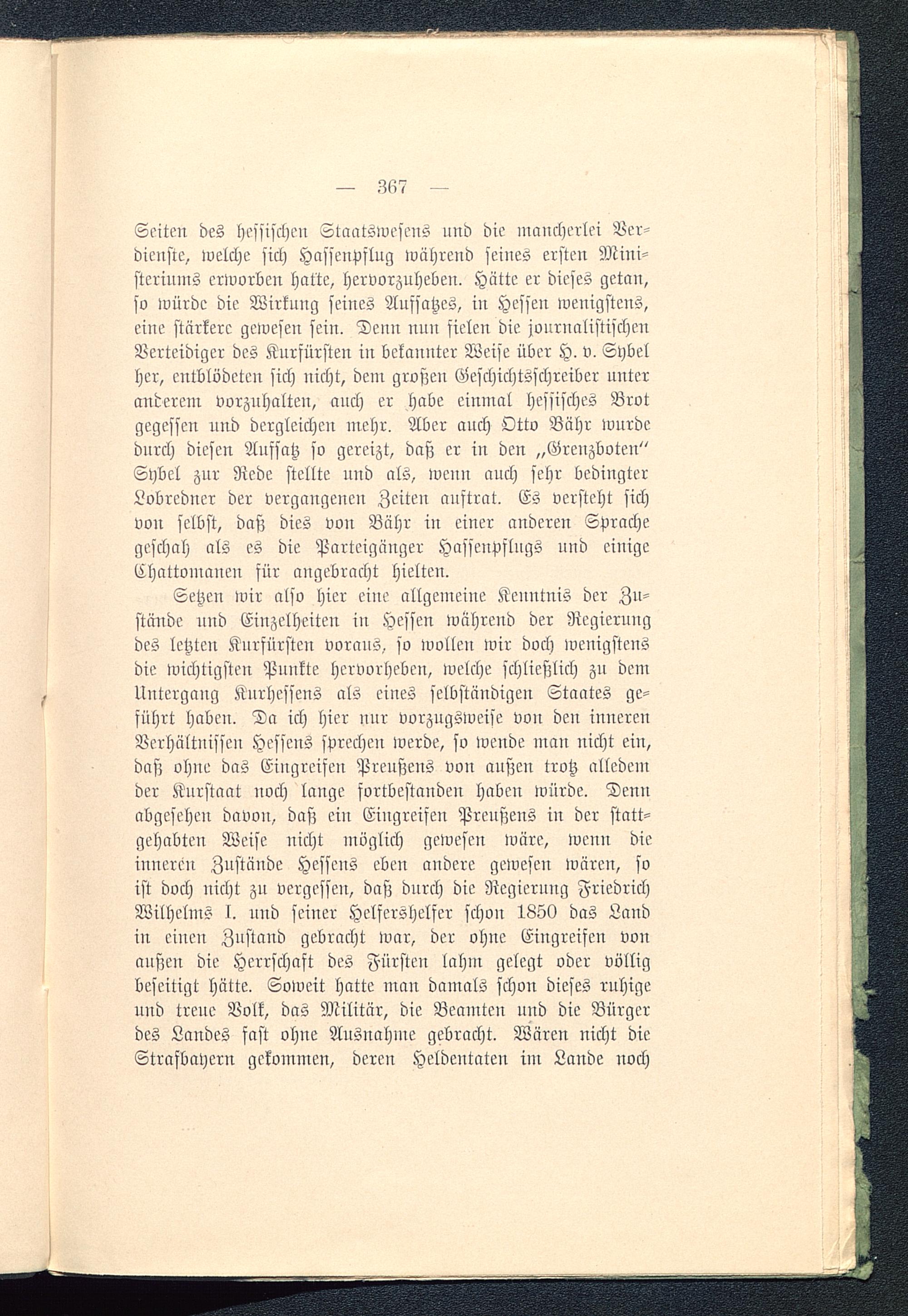 Seiten des hessischen Staatswescns und die mancherlei Ver-dienste, welche sich Hassenpflug während seines ersten Mini-steriums erworben hatte, hervorzuheben. Hätte er dieses getan,so würde die Wirkung seines Aufsatzes, in Hessen wenigstens,eine stärkere gewesen sein. Denn nun fielen die journalistischenVerteidiger des Kurfürsten in bekannter Weise über H. v. Sybelher, entblödeten sich nicht, dein großen Geschichtsschreiber unteranderem vorzuhalten, auch er habe einmal hessisches Brotgegessen und dergleichen mehr. Aber auch Otto Bähr wurdedurch diesen Aufsatz so gereizt, daß er in den „Grenzboten"Sybel zur Rede stellte und als, wenn auch sehr bedingterLobredner der vergangenen Zeiten auftrat. Es versteht sichvon selbst, daß dies von Bähr in einer anderen Sprachegeschah als es die Parteigänger Hassenpslugs und einigeEhattomanen für angebracht hielten.