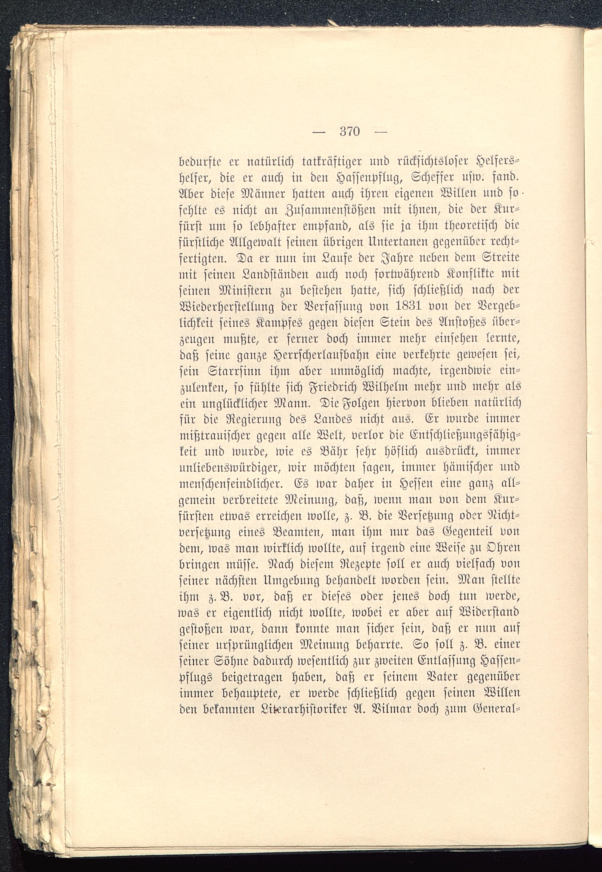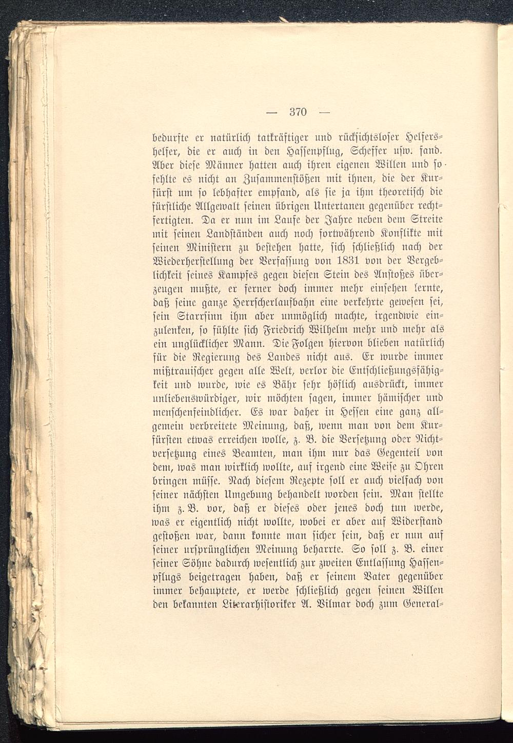 bedurfte er natürlich tatkräftiger und rücksichtsloser Helfers-helfer, die er auch in den Hasscupflug, Scheffer usw. fand.Aber diese Männer hatten auch ihren eigenen Willen und so-fehlte es nicht an Zusammenstößen mit ihnen, die der Kur-fürst um so lebhafter empfand, als sie ja ihm theoretisch diefürstliche Allgewalt seinen übrigen Untertanen gegenüber recht-fertigten. Da er nun im Laufe der Jahre neben dein Streitemit seinen Landständen anch noch fortwährend Konflikte mitseinen Ministern zu bestehen hatte, sich schließlich nach derWiederherstellung der Verfassung von 1831 von der Vergeb-lichkeit seines Kampfes gegen diesen Stein des Anstoßes über-zeugen mußte, er ferner doch immer mehr einsehen lernte,daß seine ganze Herrscherlaufbahn eine verkehrte gewesen sei,sein Starrsinn ihm aber unmöglich machte, irgendwie ein-zulenken, so fühlte sich Friedrich Wilhelm mehr und mehr alsein unglücklicher Mann. Die Folgen hiervon blieben natürlichfür die Regierung des Landes nicht aus. Er wurde immermißtrauischer gegen alle Welt, verlor die Entschließungsfähig-keit und wurde, wie es Bähr sehr höflich ausdrückt, immerunliebenswürdiger, wir möchten sagen, immer hämischer undmenschenfeindlicher. Es war daher in Hessen eine ganz all-gemein verbreitete Meinung, daß, wenn man von dein Kur-fürsten etwas erreichen wolle, z. B. die Versetzung oder Nicht-versetzung eines Beamten, man ihm nur das Gegenteil vondem, was man wirklich wollte, auf irgend eine Weise zu Ohrenbringen müsse. Nach diesem Rezepte soll er auch vielfach vonseiner nächsten Umgebung behandelt worden sein. Man stellteihm z. B. vor, daß er dieses oder jenes doch tun werde,was er eigentlich nicht wollte, wobei er aber auf Widerstandgestoßen war, dann konnte man sicher sein, daß er nun aufseiner ursprünglichen Meinung beharrte. So soll z. B. einerseiner Söhne dadurch wesentlich znr zweiten Entlassung Hasseu-pflngs beigetragen haben, daß er seinem Vater gegenüberimmer behauptete, er werde schließlich gegen seinen Willenden bekannten Literarhistoriker A. Vilmar doch znm General-